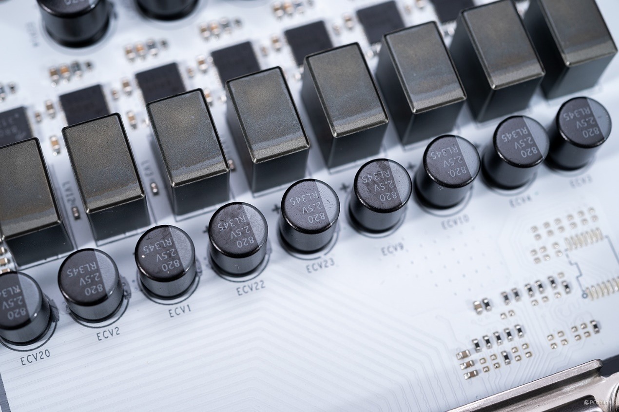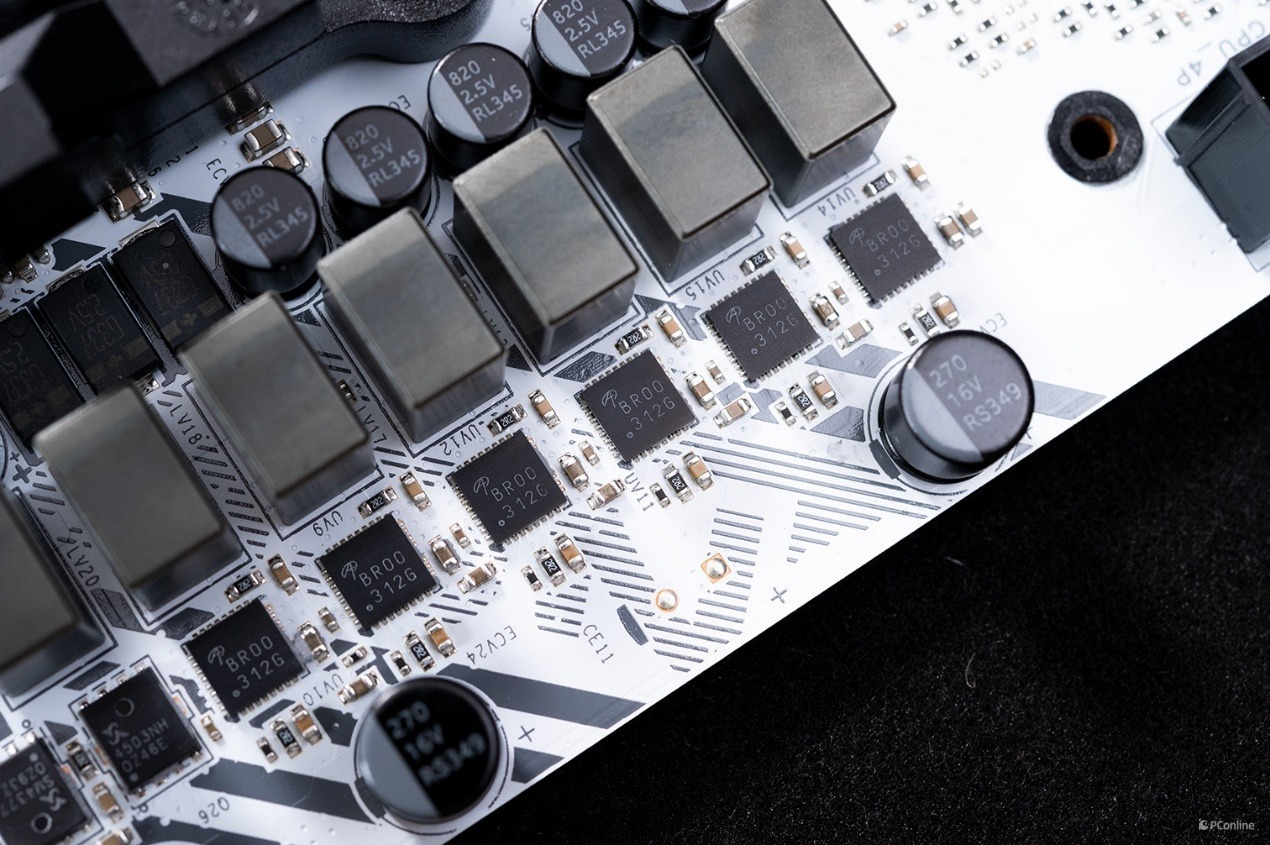 每相供电有独立的DrMos,供电芯片型号是BR00312G,来自万国半导体科技,最大支持电流为55A,采用三合一封装,节能、高效还低温。
