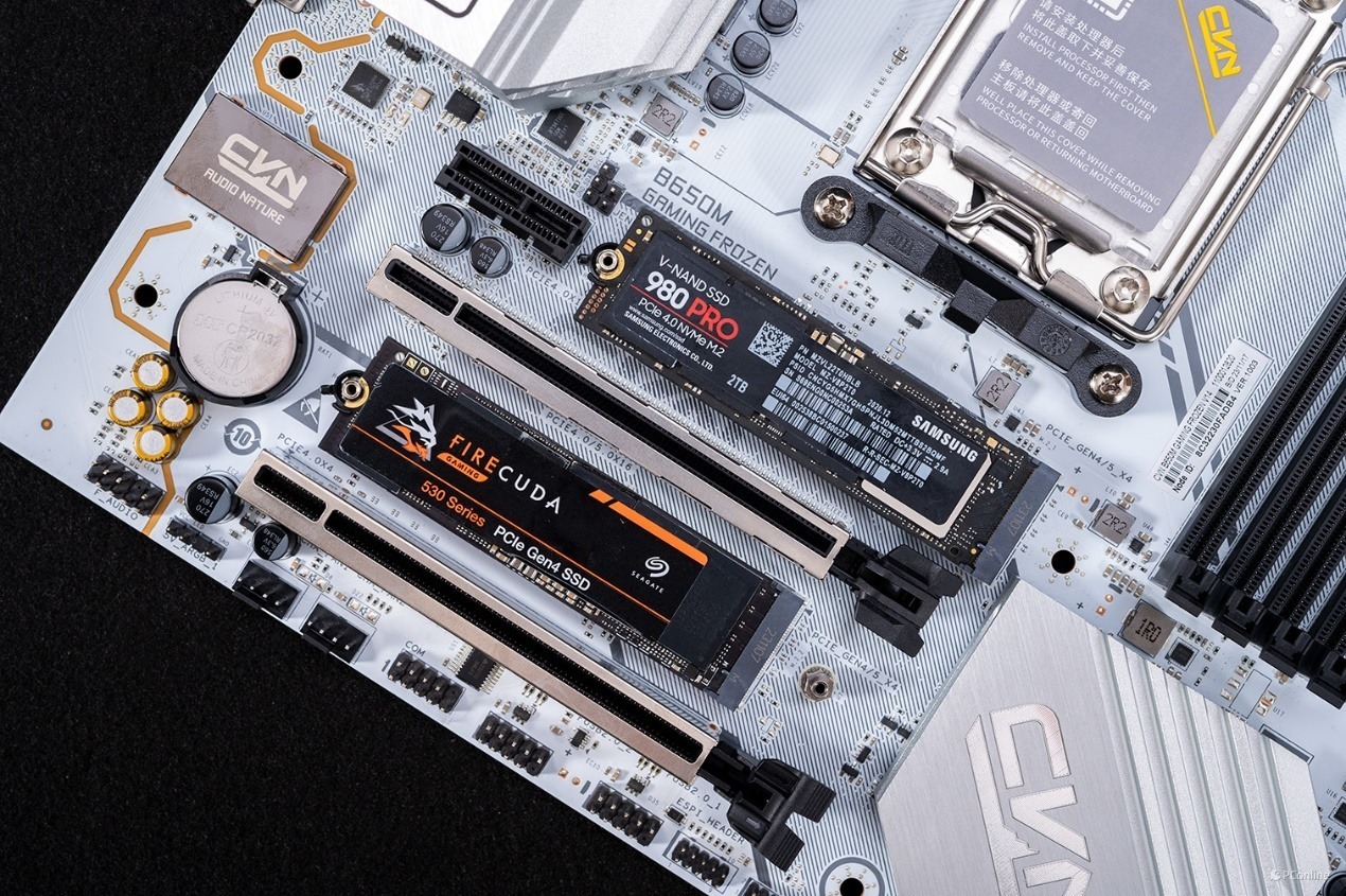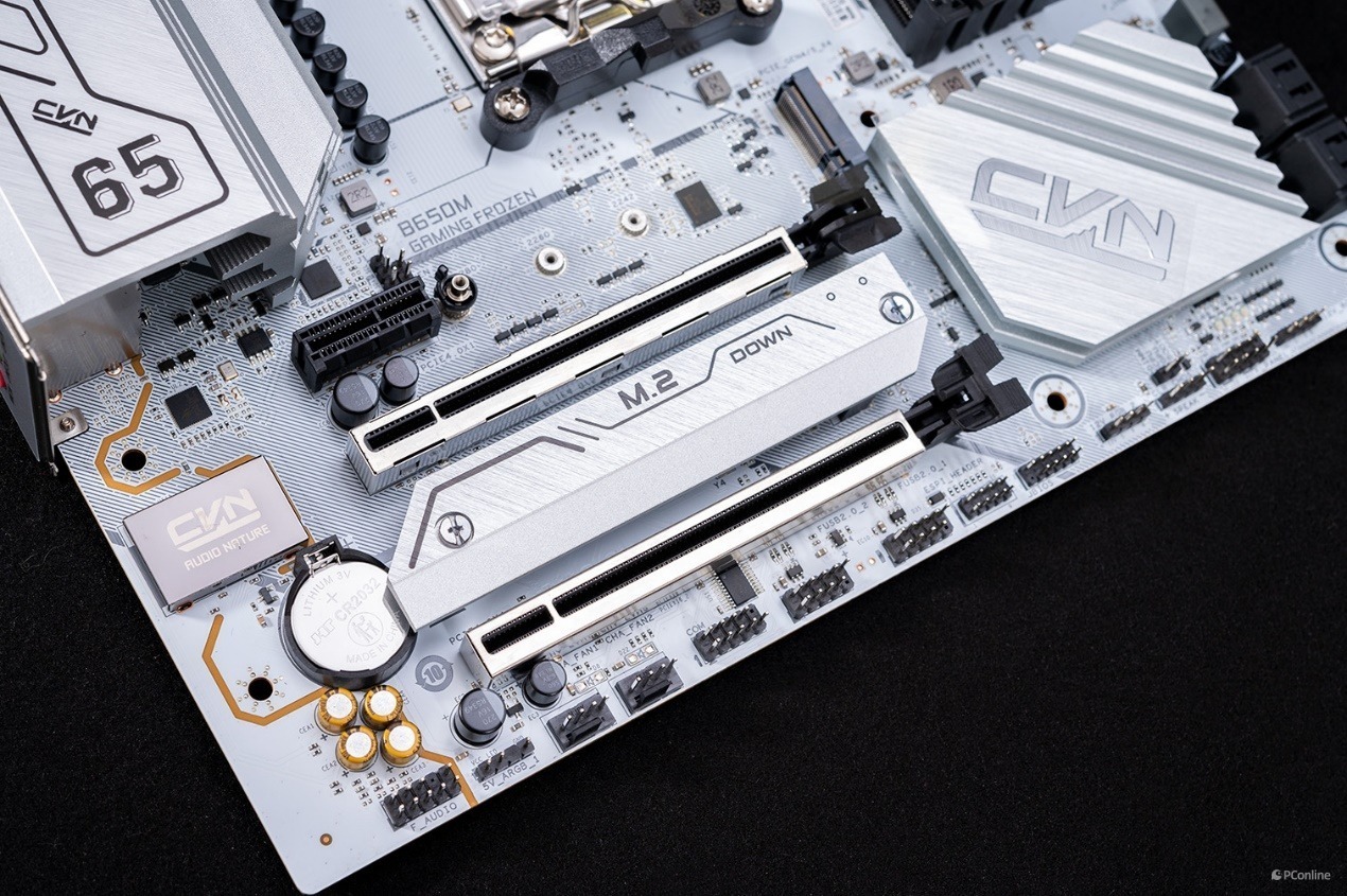 M.2固态硬盘更是极致,七彩虹CVN B650M战列舰标配了2个M.2固态硬盘插槽,支持2280、2260以及2242长度的固态硬盘,并且都是PCIe 5.0 x 4协议。