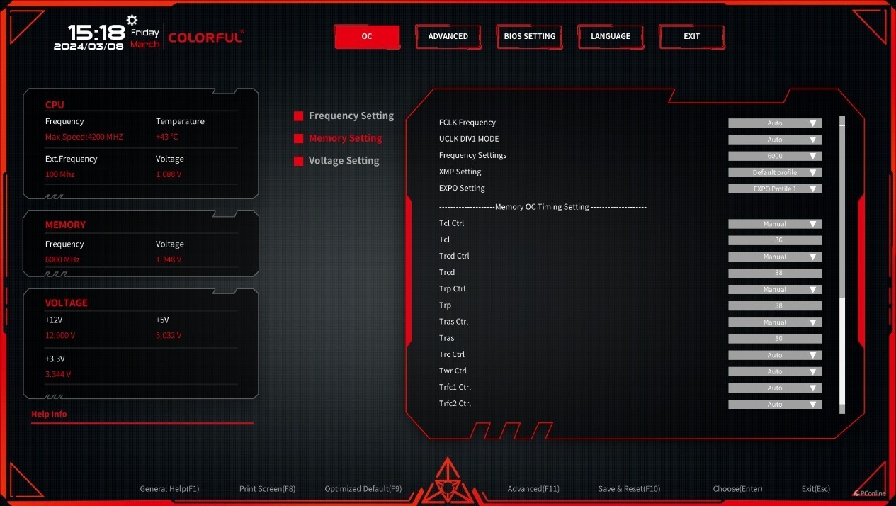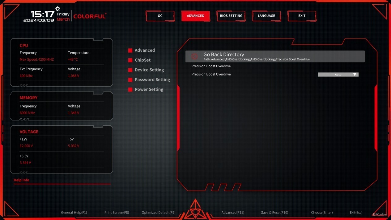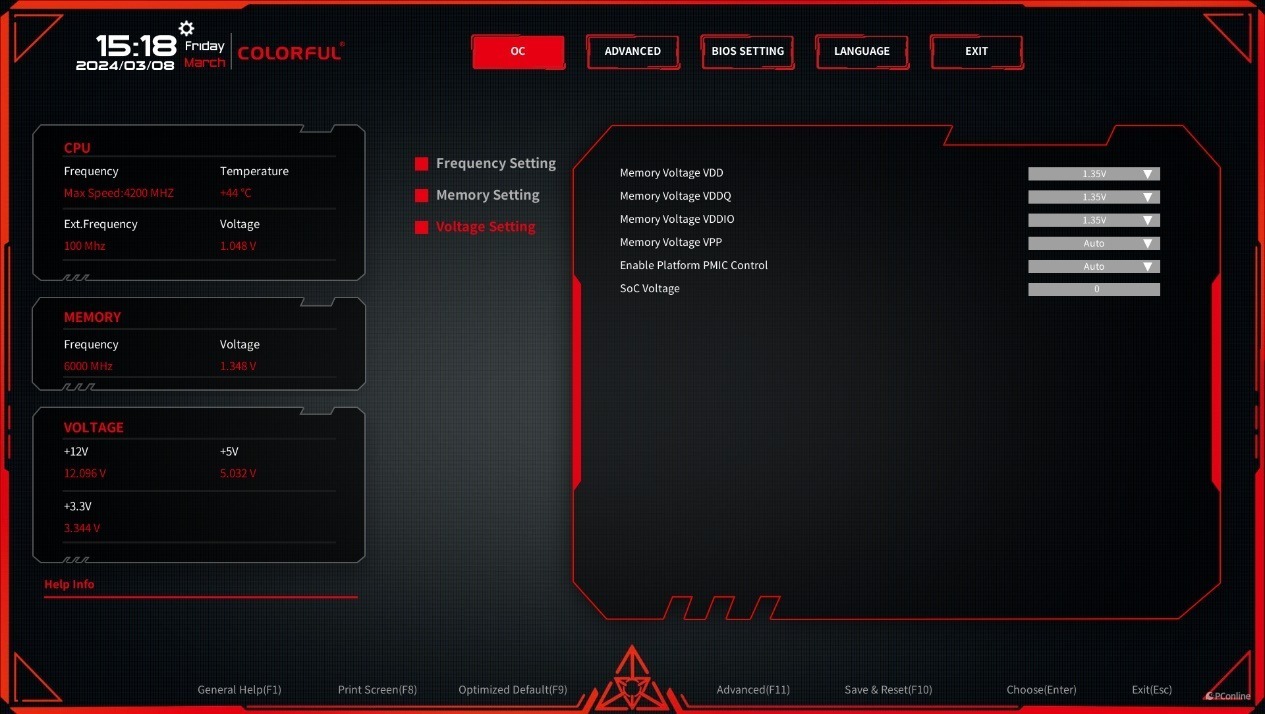 在电压设置界面内,像CPU、内存等电压都可以直接调节,并且还有操作提示,可以说是相当贴心了。