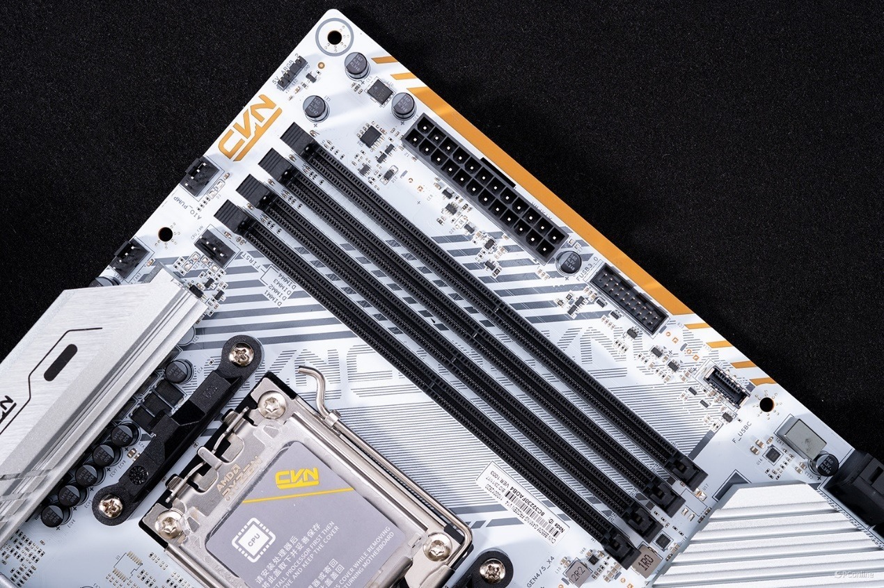 主板搭载了4条标准DDR5内存插槽,最高支持192GB容量,支持AMD EXPO技术,官方表示支持7600MHz(OC)。
