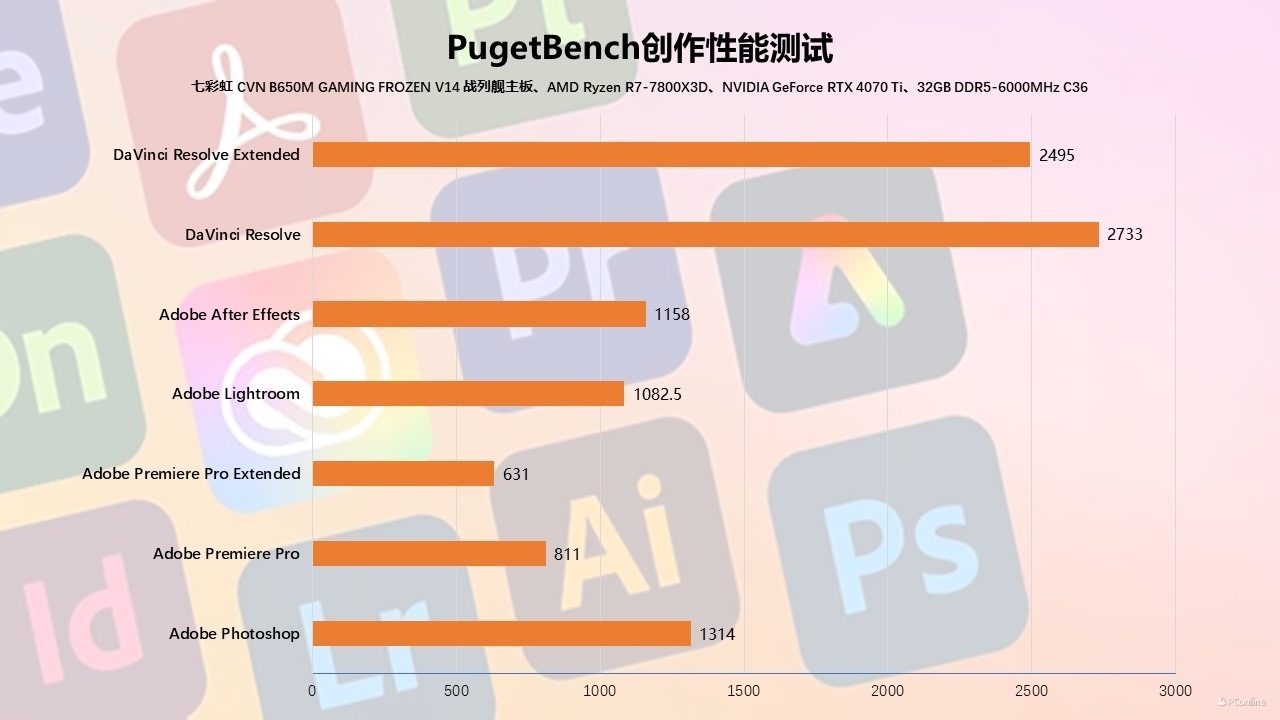 在图片处理测试部分,主要关注Photoshop以及Lightroom的成绩,这套平台分别得分1314和1082.5,从分数可以看出,像PS以及LR这种比较吃CPU性能的软件,7800X3D配七彩虹CVN B650M战列舰主板可以说是丝般顺滑,完全能够释放应有的性能。