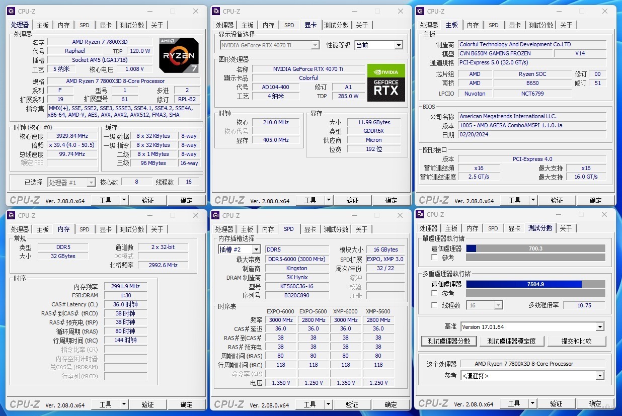 最重要的CPU基准测试我们也进行了,实测7800X3D跑出了单核700.3,多核7504.9的成绩,这个成绩与X670平台上的相差无几,看来七彩虹CVN B650M战列舰主板确实性能出色,完全能够胜任带动7800X3D的重任,以这款主板的配置,相信锐龙9来了也没有问题。