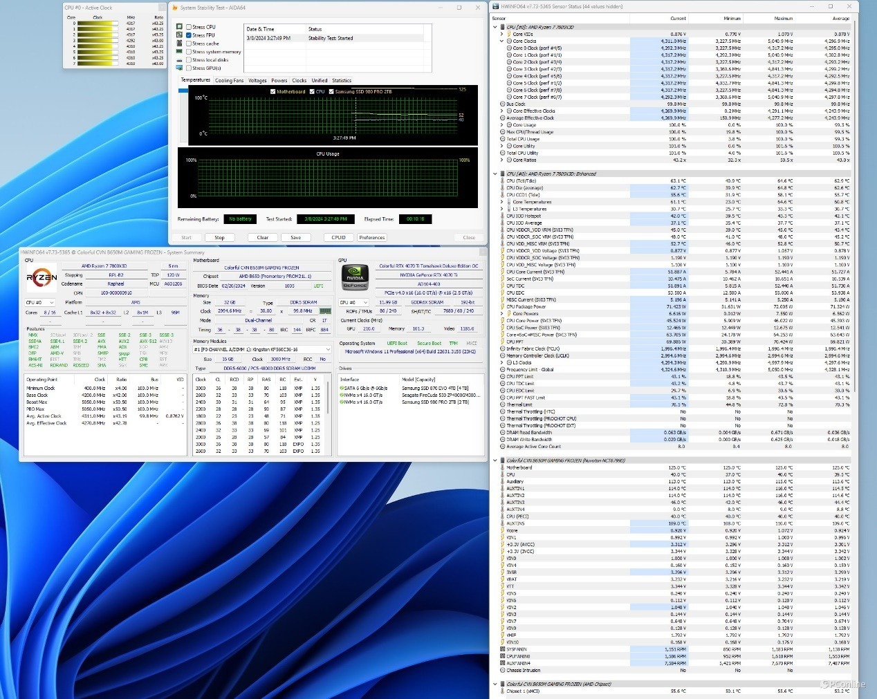 在烤机5分钟之后,可以看到7800X3D处理器一直维持在4.3GHz左右,全程也不降频也没有过热,意味着七彩虹CVN B650M战列舰主板的供电模组可以很好地满足新一代AMD锐龙7000系处理器的标准功耗所需,用它带动R9级别的处理器应该也没什么问题。