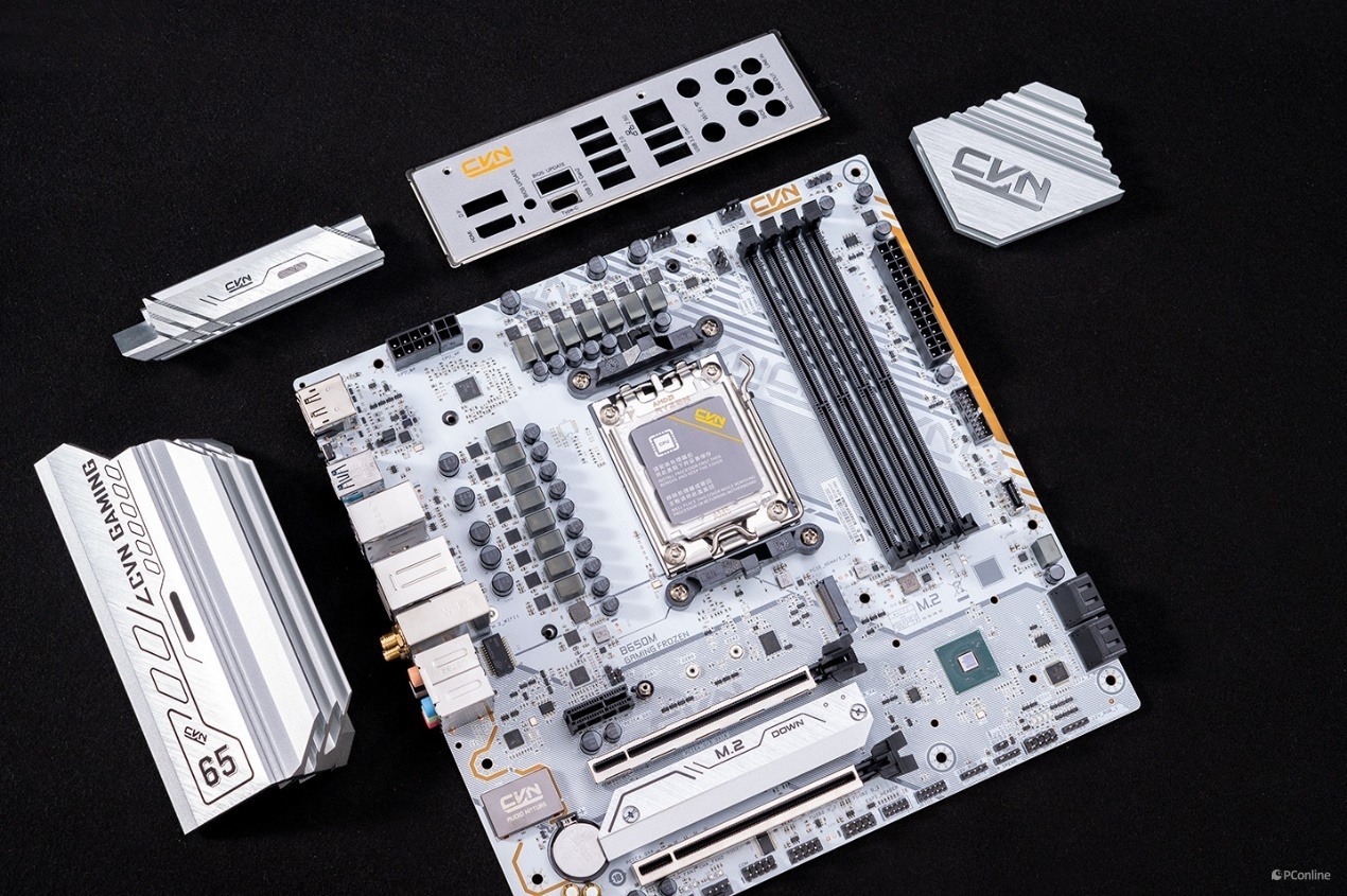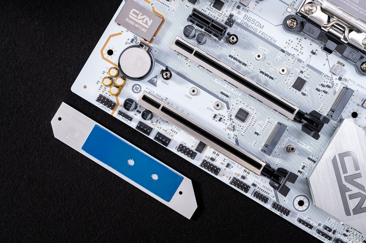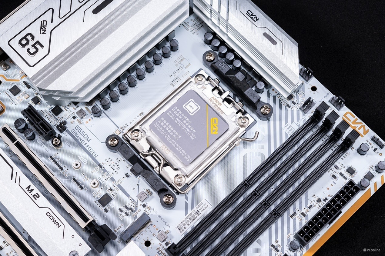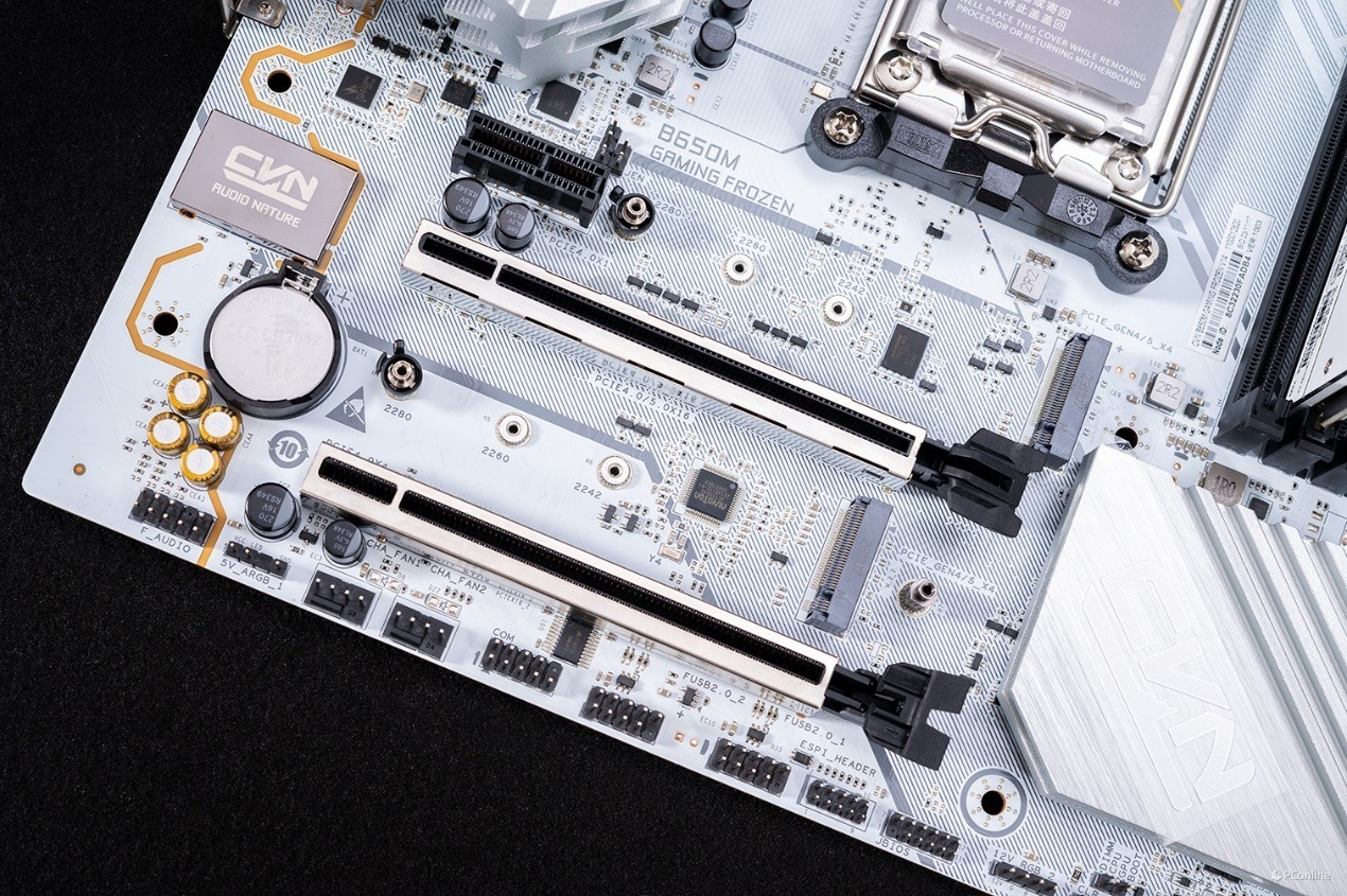 介绍完芯片组,下面正式进入主题,本次的主角——七彩虹 CVN B650M GAMING FROZEN V14战列舰,其基于AMD B650E芯片组打造,采用M-ATX规格,在外观上这款主板延续了之前的科幻风格,银白相间的标志性设计,高级感跃然纸上,在白色主题装机上,这款主板一定是颜值党的首选。