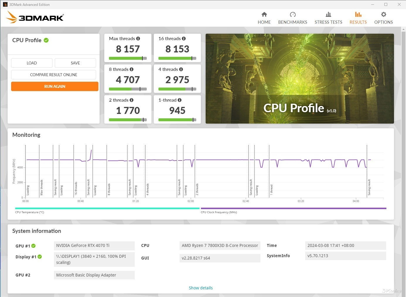 最后是3DMark CPU Profile测试,这项测试可以更精准的测试CPU在单核与多核方面的性能表现,实测7800X3D的单线程分数为945,最大线程分数为8157,表现不错,作为一款专为游戏而生的CPU,这个成绩已经完全能够满足主流用户的需求了。