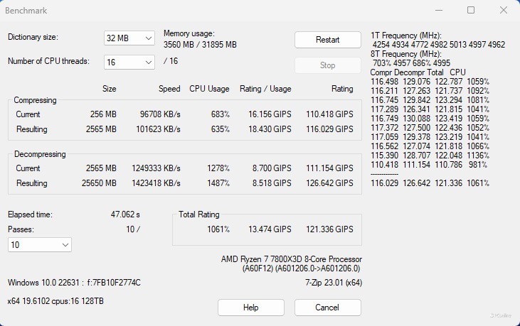 接着是7-ZIP的解压缩测试,压缩时这套平台的速度为101623KB/s,而解压则能达到1423418KB/s,总评成绩部分,CPU使用率为1061%、使用率评分为13.474 GIPS,总体评分为121.336 GIPS。