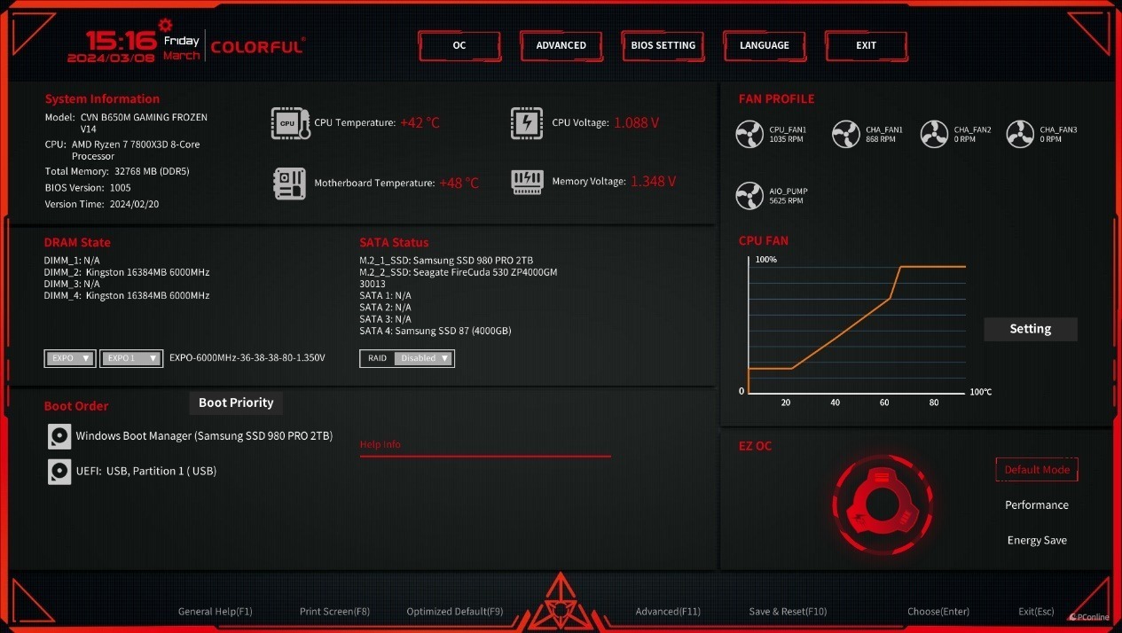 硬件够硬,还要软件够软。七彩虹 CVN B650M 战列舰主板的BIOS相比之前更清晰明了,首次进入BIOS就可以看到整个系统的主要信息,包括CPU温度、电压,主板温度和内存电压等,并且还能快速开启内存超频,操作方便,对玩家十分友好。