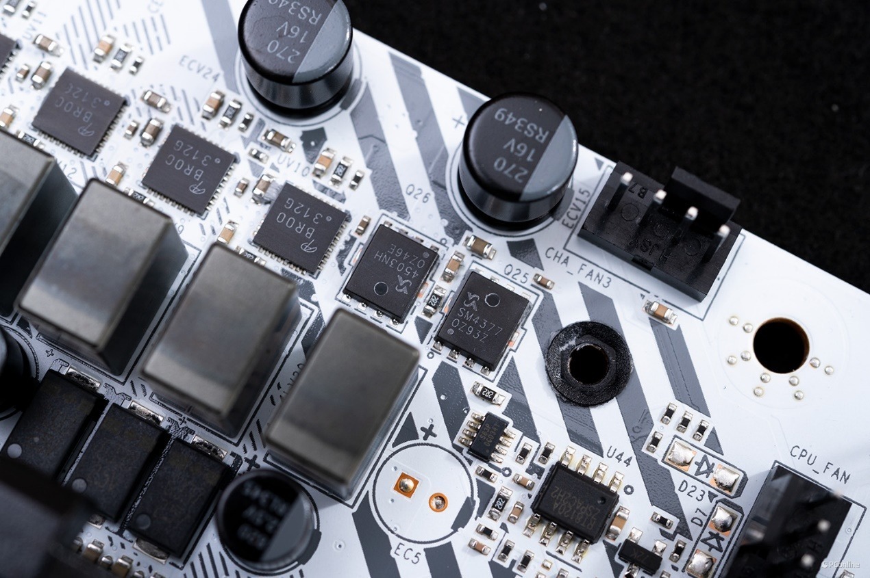 主板背面也是纯白底色,布局非常整洁,看起来更是赏心悦目。