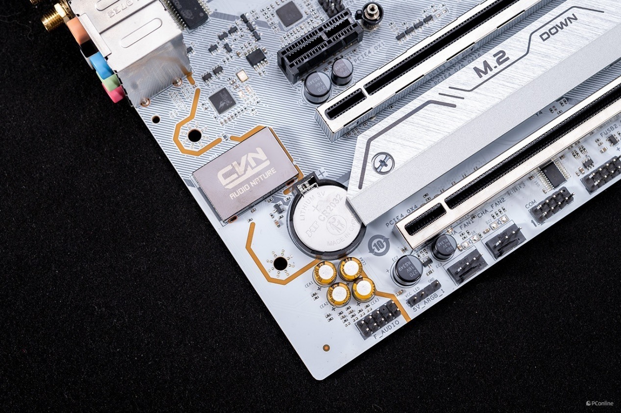 除了供电电路处有VRM散热装甲外,像是M.2接口、PCH南桥等区域也是堆料十足,大面积的银色散热装甲搭上白色的PCB主板宛如一艘驰骋海疆的战列舰破浪前行。