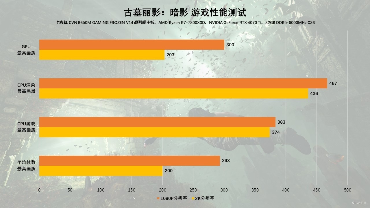 老牌游戏《古墓丽影》我们也测了,这款游戏有着多年的内容与游戏技术迭代革新,因此也被不少玩家用于评估CPU性能。实测1080P下游戏帧数为293 FPS,其中涉及CPU分数的成绩为CPU游戏平均帧数为383;CPU渲染平均帧数为467。2K环境下,性能释放也相当激进,即使是最高画质下,也能做到超越电竞的144Hz,200FPS的表现甚至可以挑战240Hz。