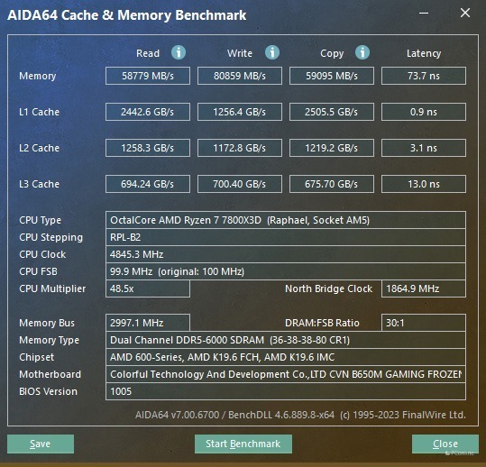 众所周知,这代锐龙7000系处理器支持DDR5,因此我们直接上了DDR5-6000MHz C32的内存,一次就点亮了,不得不说,这一度颠覆了我对七彩虹的印象。实测2根16GB的内存稳定运行,此时读取58779MB/s,写入80859MB/s、复制59095MB/s,甚至延迟也不错,仅73.7ns。这里需要说明的是,7800X3D采用的是单CCD设计,相比双CCD的老大哥7950X3D来说,单 CCD最大的好处就是省去了调度难题,但是在内存的读取效能上则会有所牺牲。