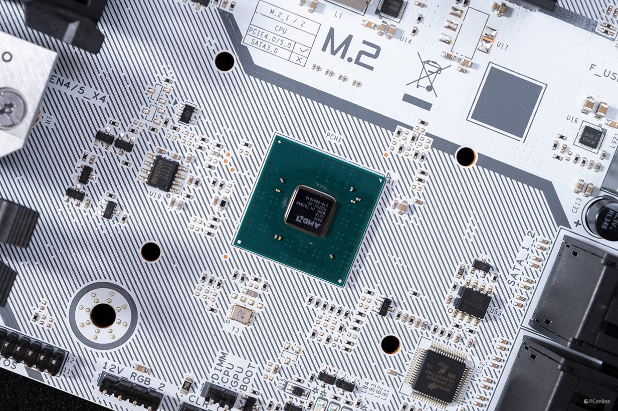 卸下以后就能看到B650芯片。其主要负责I/O接口等一些外设接口的控制及提供部分PCIe通道。在规格上虽然略输X670,但是对大多数玩家来说,B650的性能和配置都是够用的。