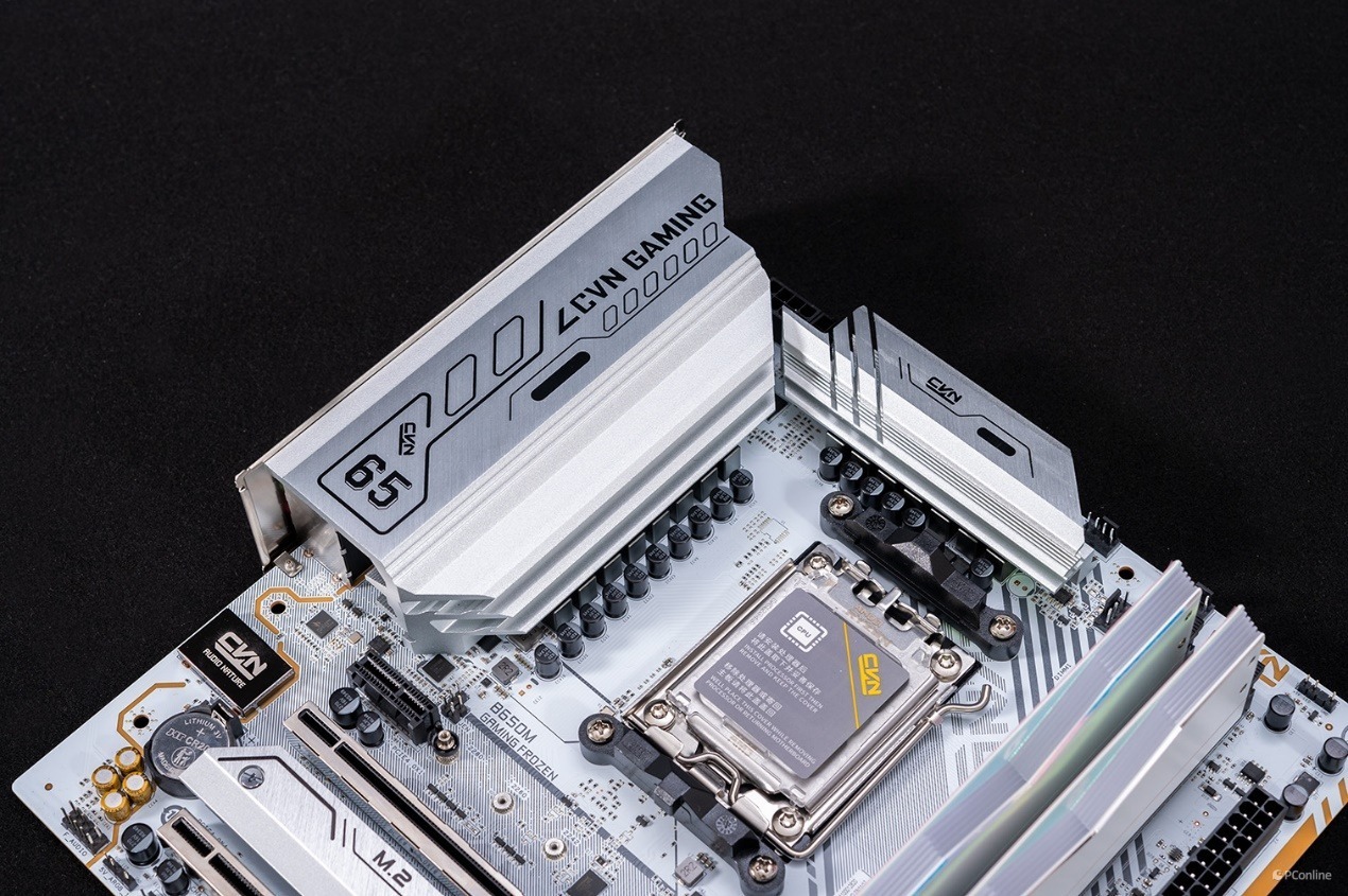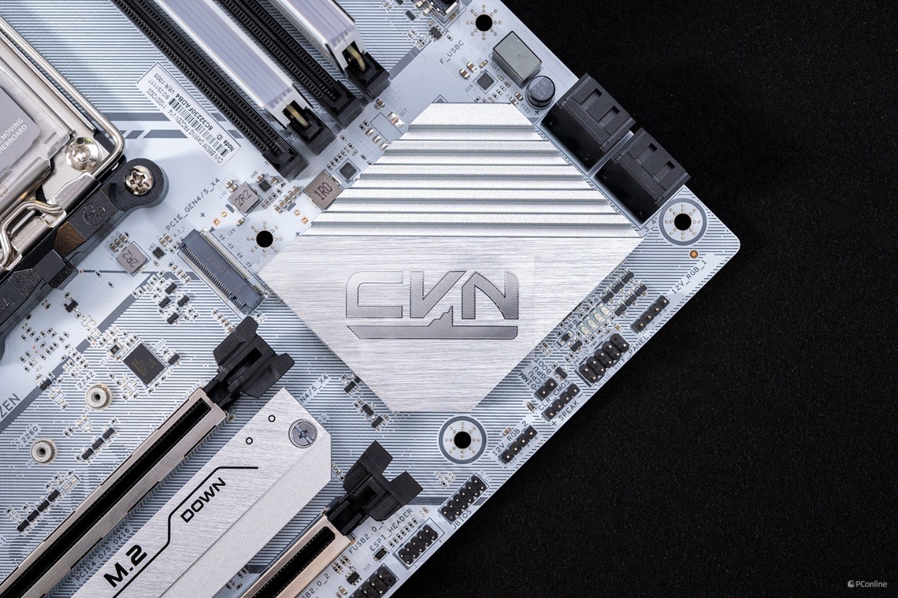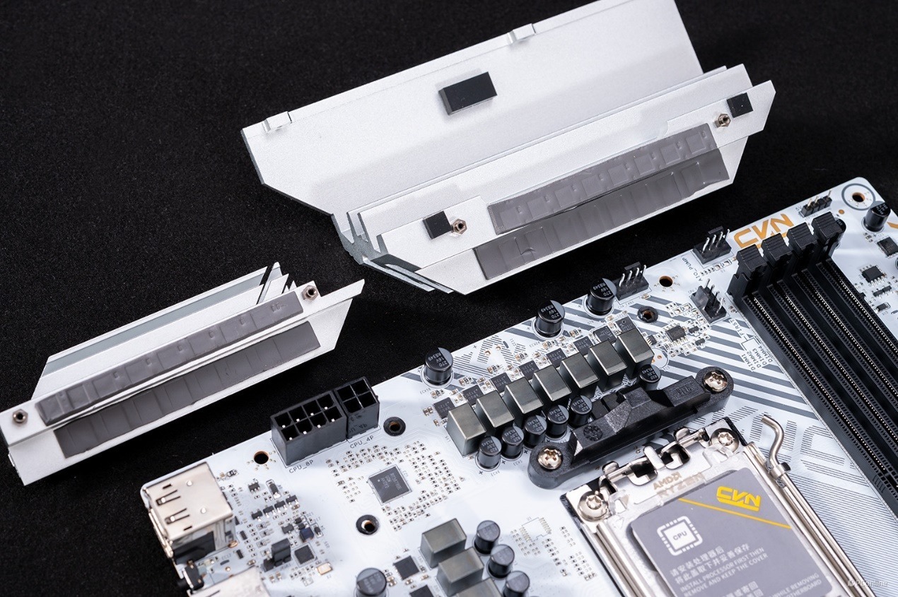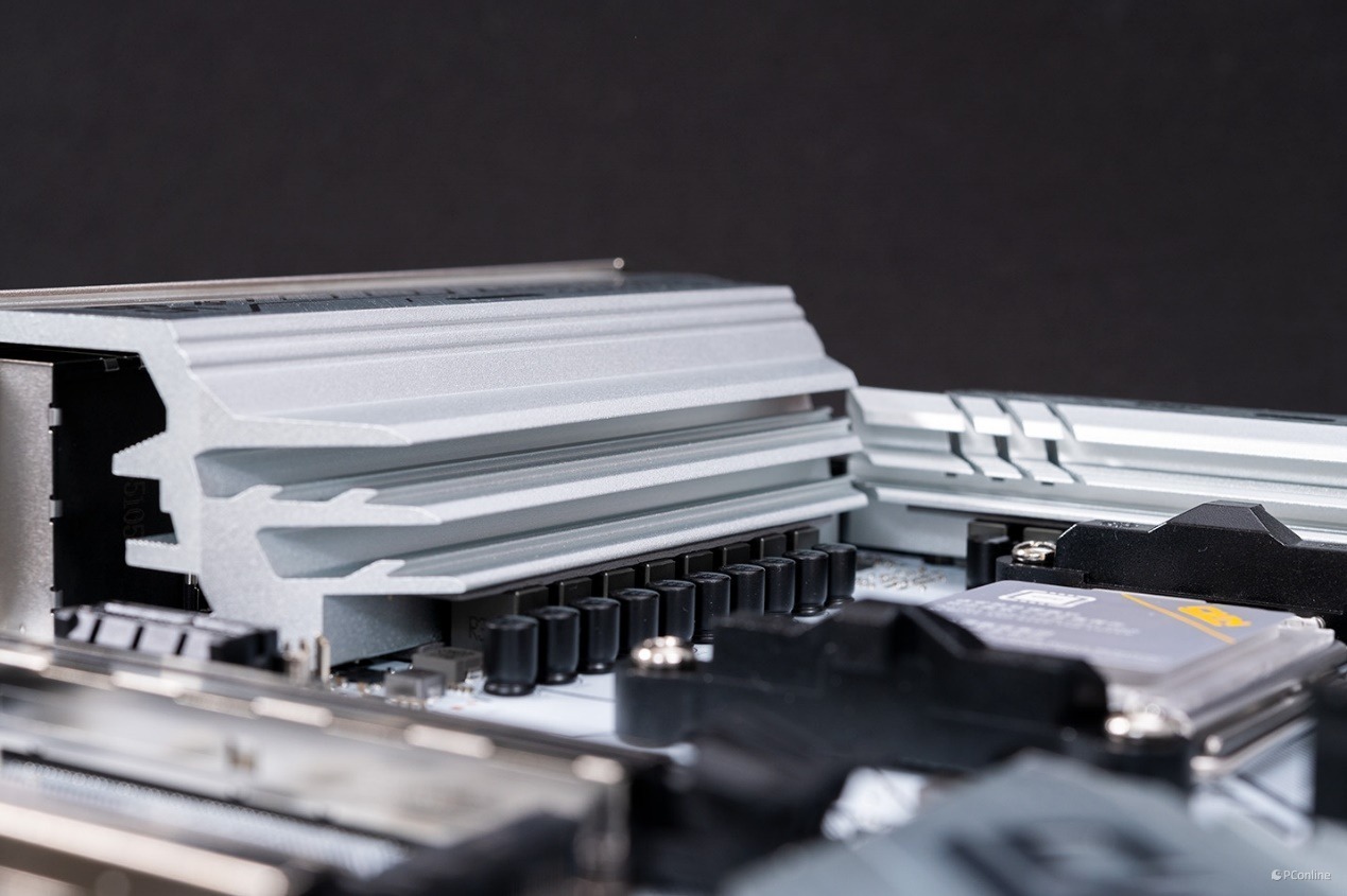 CPU插座的四周是大面积的一体式VRM加厚鳍片散热模块,外观为银白色,与PCB的相对应。双分区的设计有效覆盖了核心DrMos,多重CNC切割结构既能大幅增加交换面积,也给简约的散热模块增加了一丝电竞感。