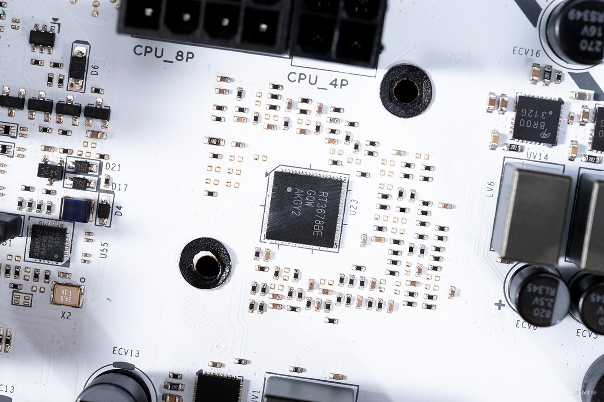 CPU与核显供电的PWM芯片则是RT3678BE,一款8 + 2相的控制器,来自立锜科技。