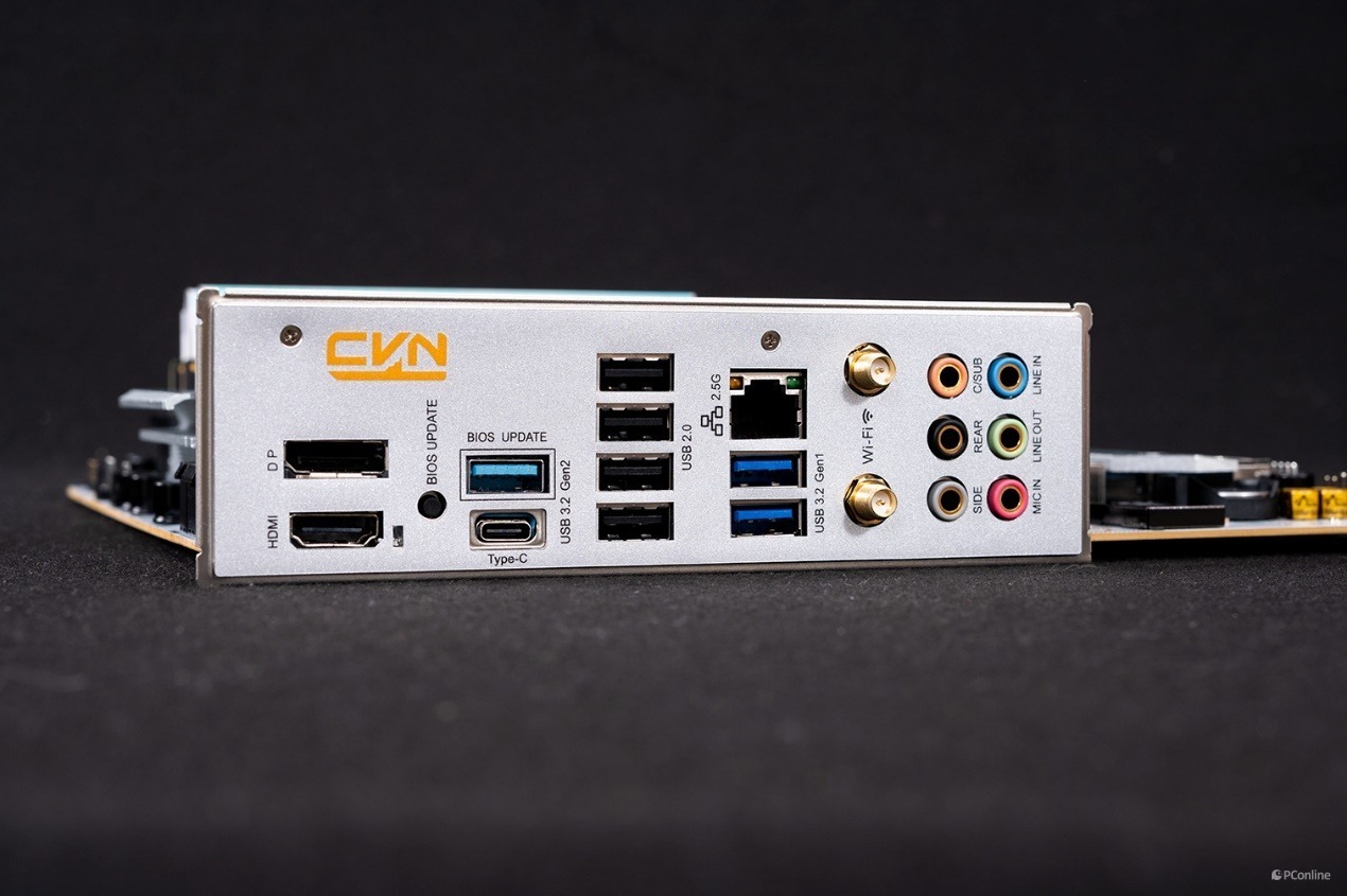 主板有着相当丰富的IO接口,从上到下分别是1个DP 1.2,1个HDMI 1.4,1个USB 3.2 Gen 2接口(支持盲刷BIOS)、1个Type-C,4个USB 2.0和2个USB 3.2 Gen 1接口;此外还包括1个2.5G有线网口、Wi-Fi 6天线接口以及7.1声道音频接口。