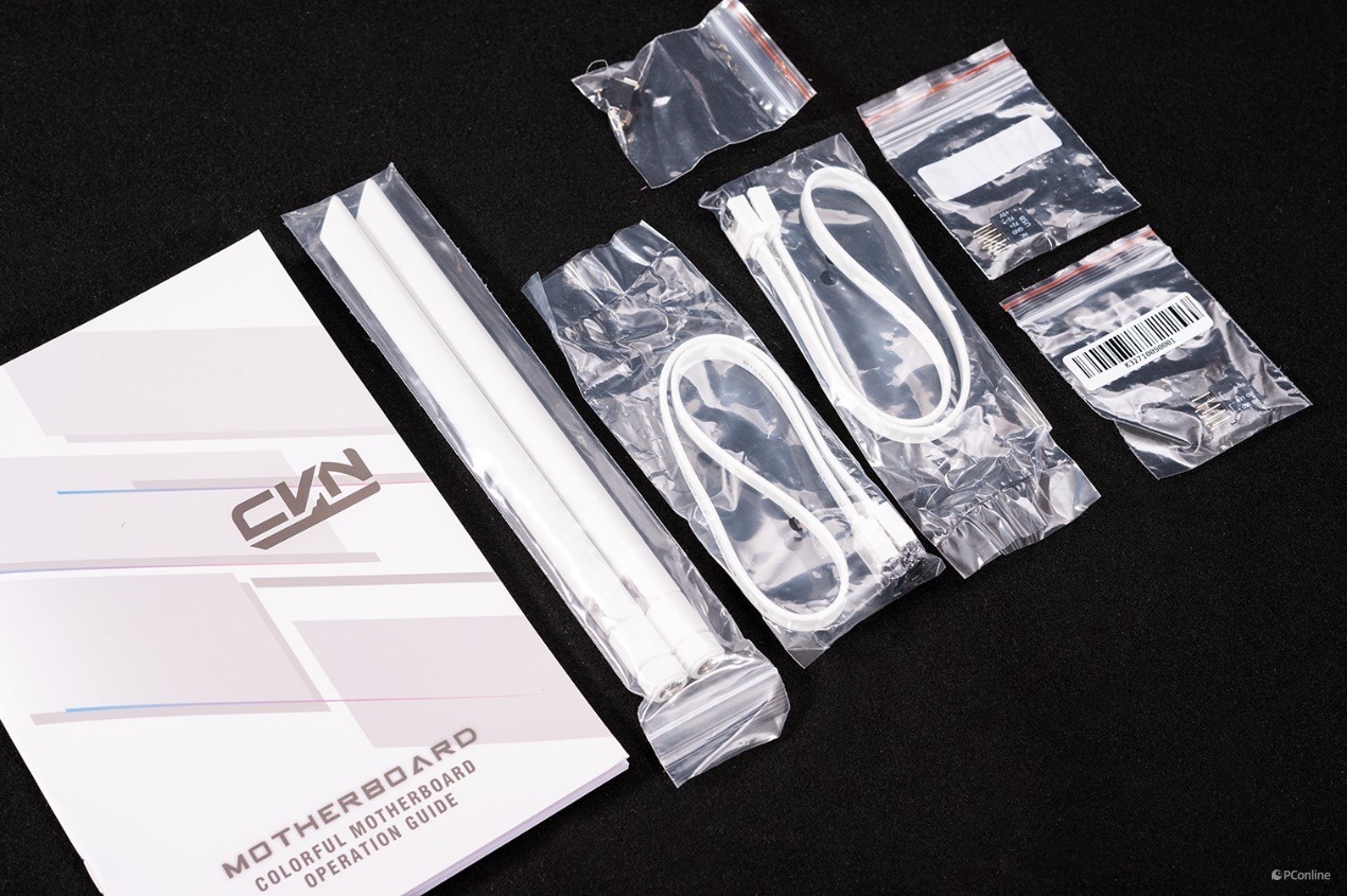 包装内除了主板本体,还有各式各样的配件,使用手册, SATA硬盘数据线、跳线模块、M.2螺丝、垫片、WiFi天线等一应俱全。并且七彩虹还很细节,配件一并设计成白色的,与主板的风格十分契合。