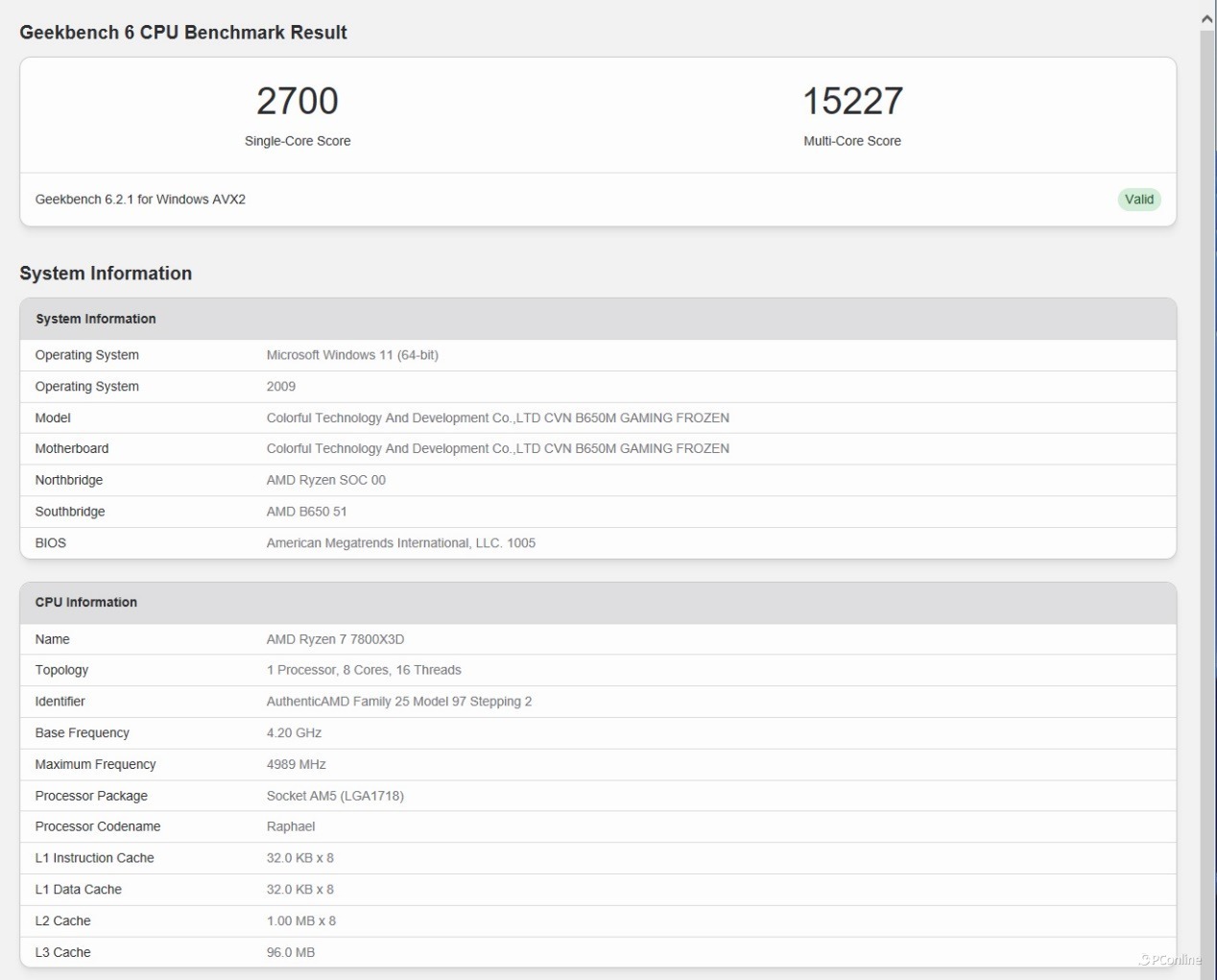 我们再看看一款熟悉的软件——GeekBench,大家在手机评测中应该经常见到,不过它也可以用于衡量桌面端处理器的单核/多核性能。我们用最新版本实测7800X3D的单核为2700,多核为15227,性能表现不错。