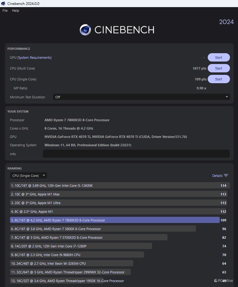 而在CineBench2024里,这套平台同样有不俗的表现,7800X3D处理器的单核为109 pts、多核为1077 pts,MP Ratio为9.90x。