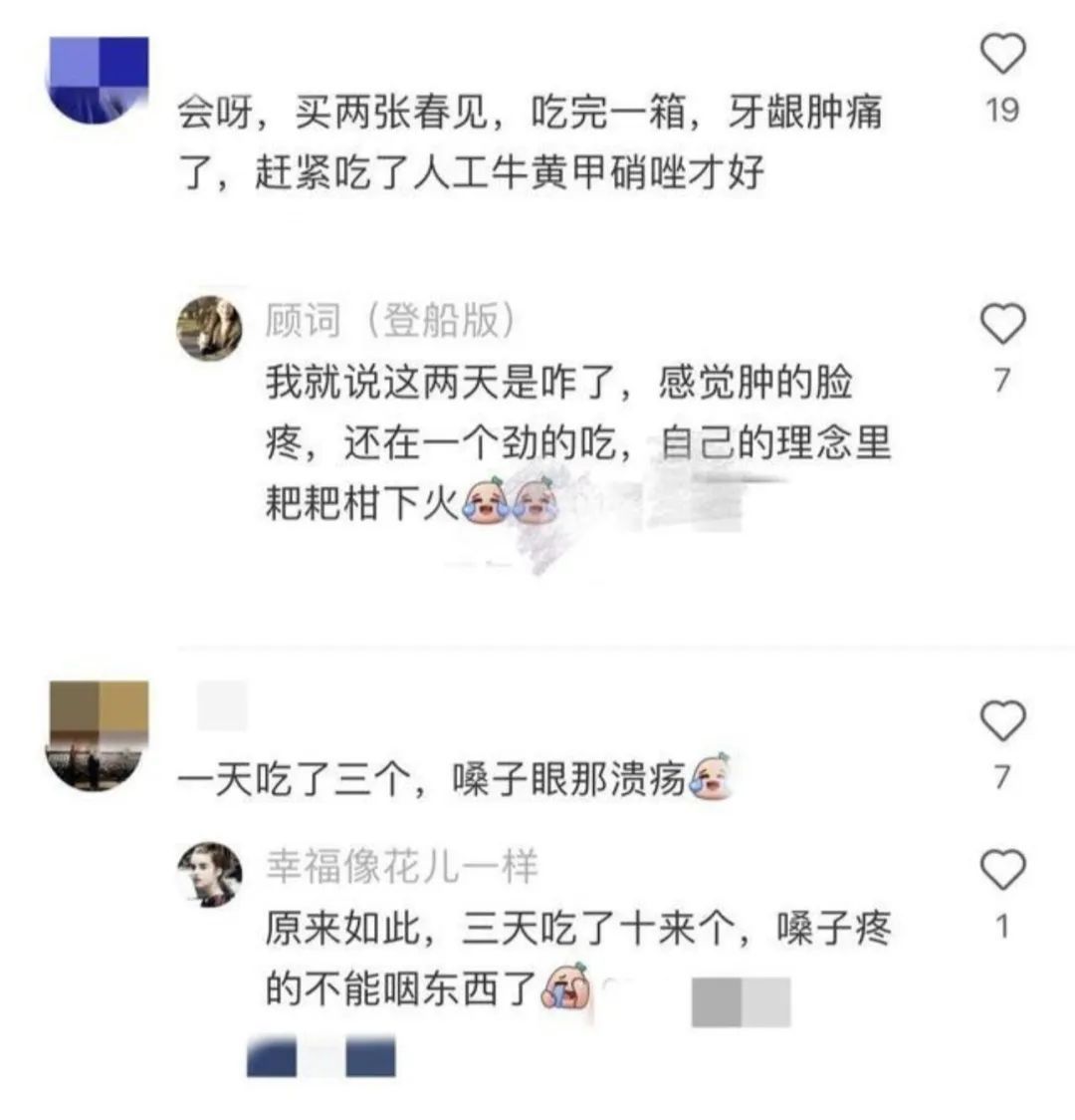 张女士(化名)平常就容易长溃疡,耙耙柑是她用来败火的水果。闲来无事,她总在不知不觉中一个接一个炫,但溃疡迟迟没好,似乎还加重了。她不禁疑惑,是不是耙耙柑吃多了导致“火”更大了?在社交平台上,也有人分享类似的经历,“一天吃三个长溃疡了”“两天吃了一箱,牙龈肿了”“亲测上火,口腔溃疡吃不了饭”……