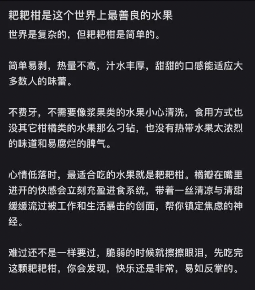 前两天,一名网友为耙耙柑创作的小作文迅速登上微博热搜榜。该网友形容耙耙柑是世界上“最善良的水果”,“世界是复杂的,但耙耙柑是简单的。简单易剥,热量不高,汁水丰厚,甜甜的口感能适应大多数人的味蕾。不费牙,不需要像浆果类的水果小心清洗,食用方式也没其它柑橘类的水果那么刁钻,也没有热带水果太浓烈的味道和易腐烂的脾气。”