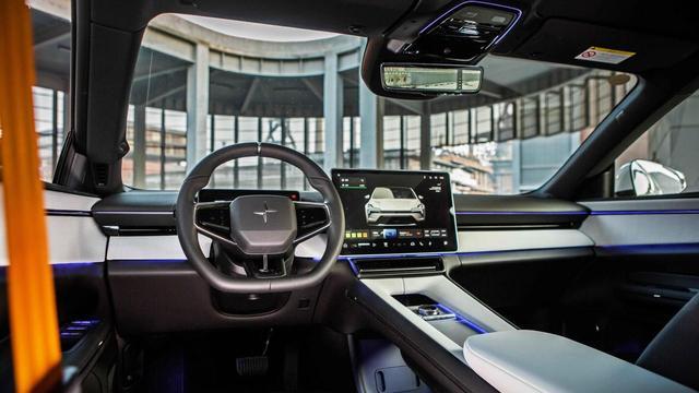 极星4的内饰方面,依然是时下流行的极简风,采用9英寸仪表与15.4英寸大屏相搭配,同时车内也运用了浅蓝色、白色与黑色搭配,低饱和度色系让视觉效果极其清新通透。