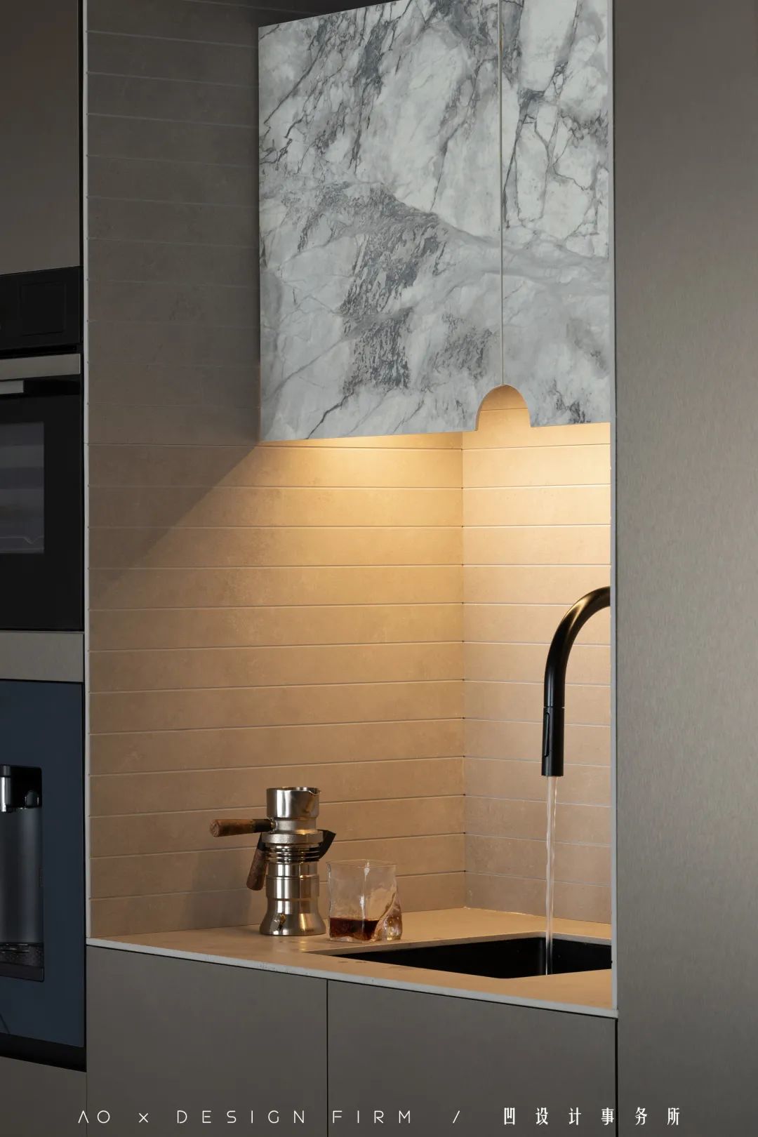 位于玄关走廊,无法拆除的L型承重墙,设计师巧妙地将其改造成了小水吧,旁边安装了蒸烤箱,承担了家里西厨区的功能。
