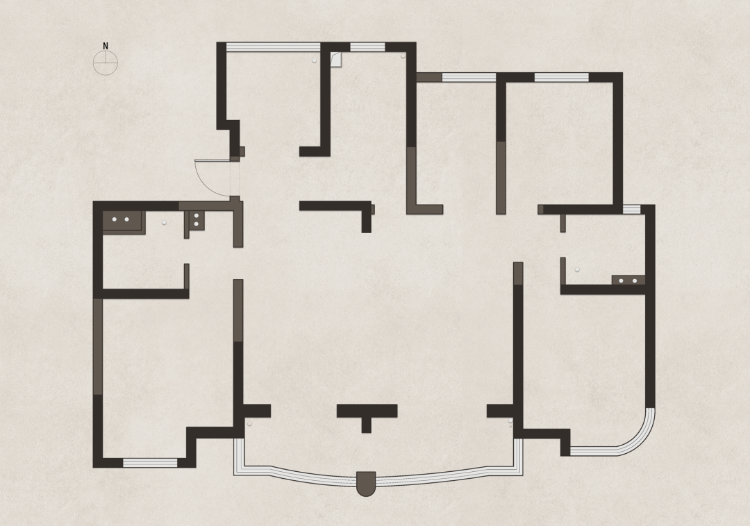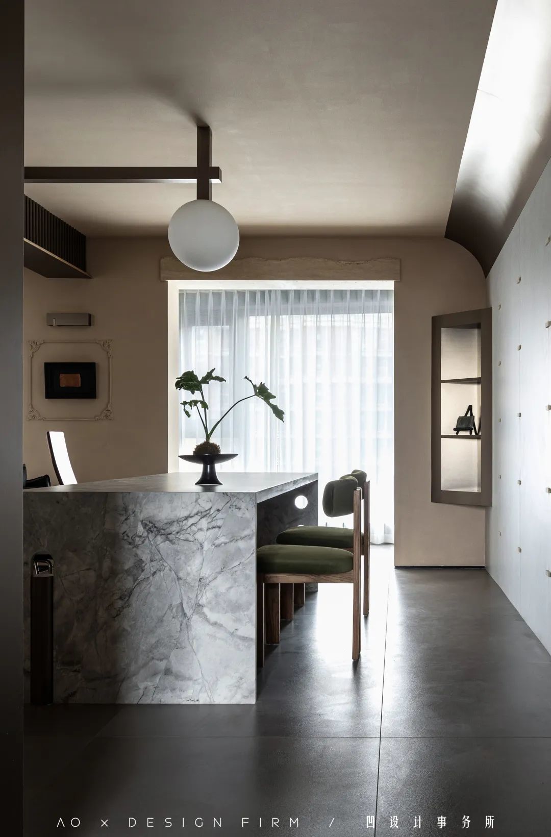 弧形的落地窗把更多的光线引入家中,定制柜的开放格,即便空无一物,当有阳光照进来的时候,返璞归真的洞石材质,就会自然形成家里的一处风景。