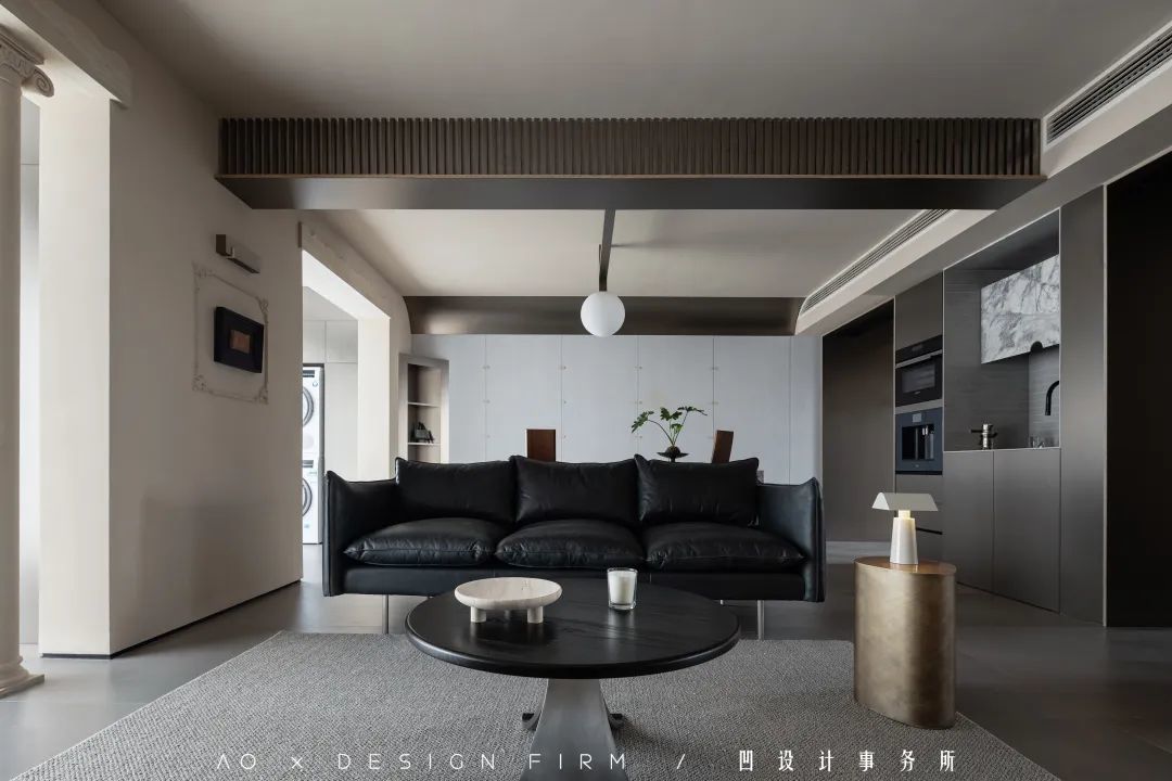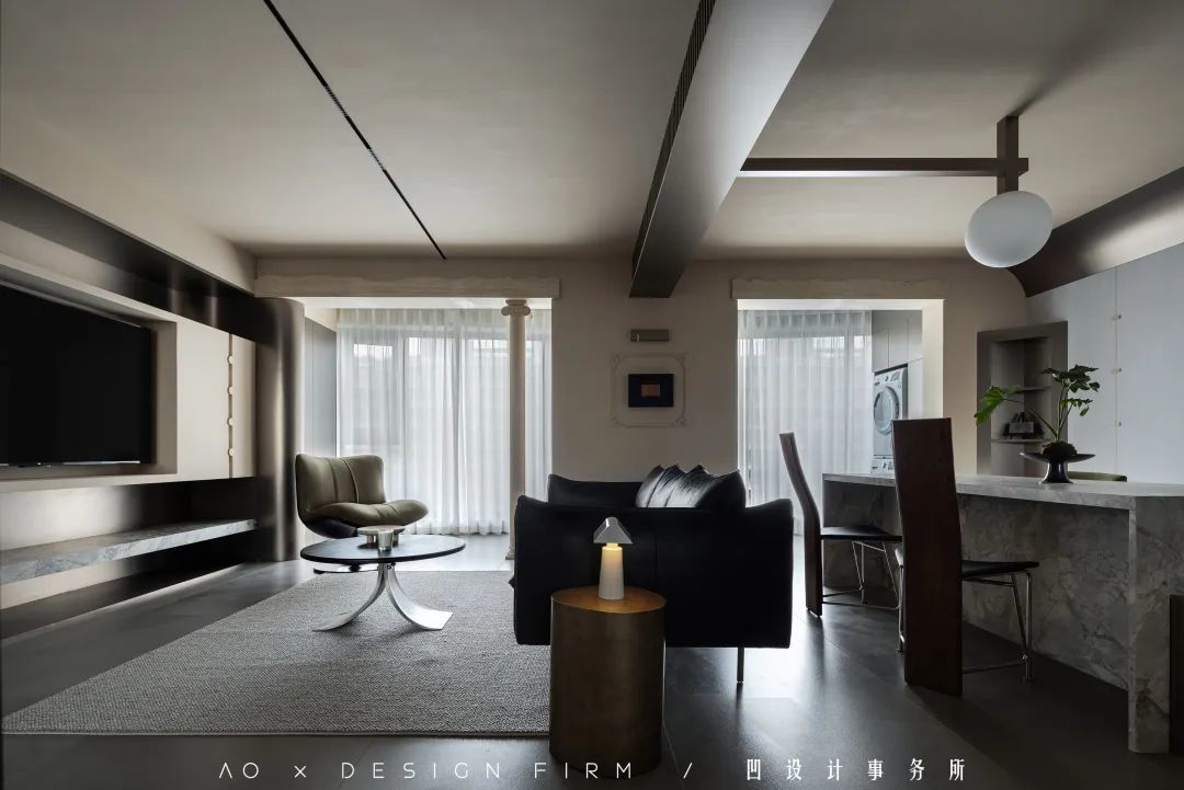 类似餐厅金属壁柜带来的材料混搭,同样出现在客厅区域。用于区分客厅和餐厅的横梁,设计师将它层层敲掉,露出水泥,两边用木格栅包裹,底部使用海洋板打基层,再用柔光的3mm金属板贴面。