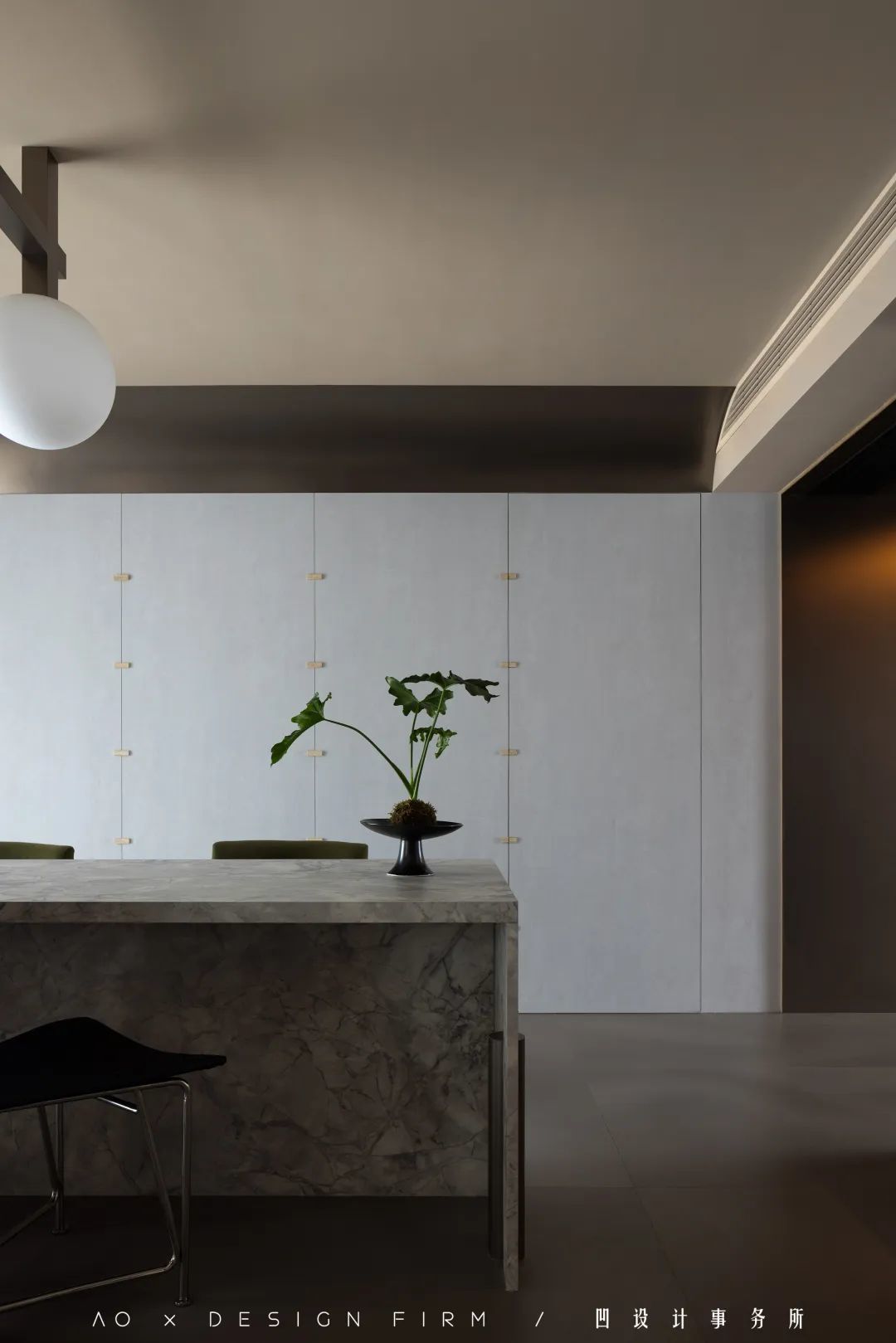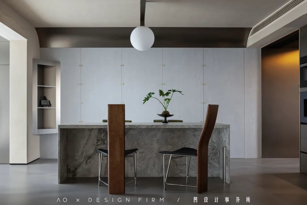 餐桌的背景墙,以整体的木饰面作为装饰,不但“藏”进了卧室门,还用东方传统的“盘扣”作为装饰。设计师介绍说,这是在纵向凿出尺度相同的凹槽里嵌入石材,以相互错位、嵌套的形式呈现,带来恰到好处的中古风韵味。
