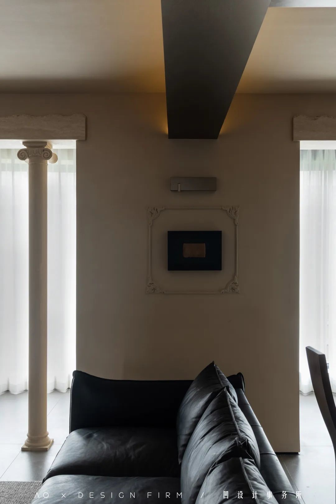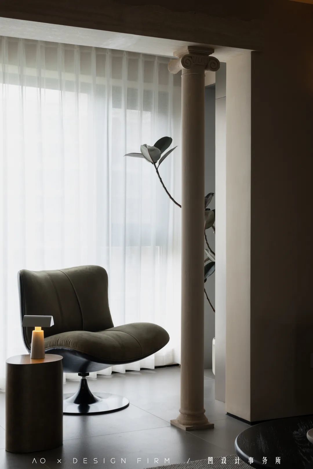 垭口处的罗马柱堪称妙笔,让这个以大地色系为基调的空间丰富而有层次。