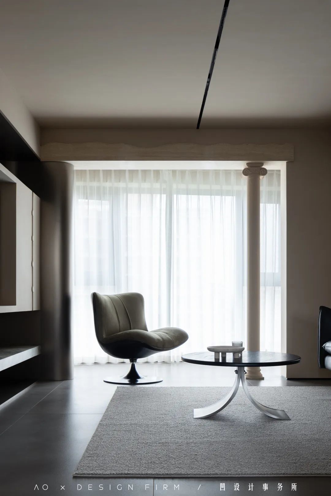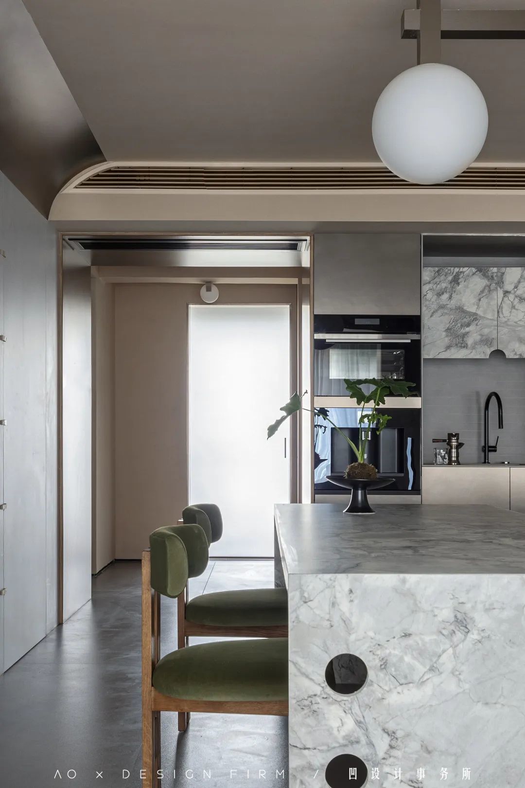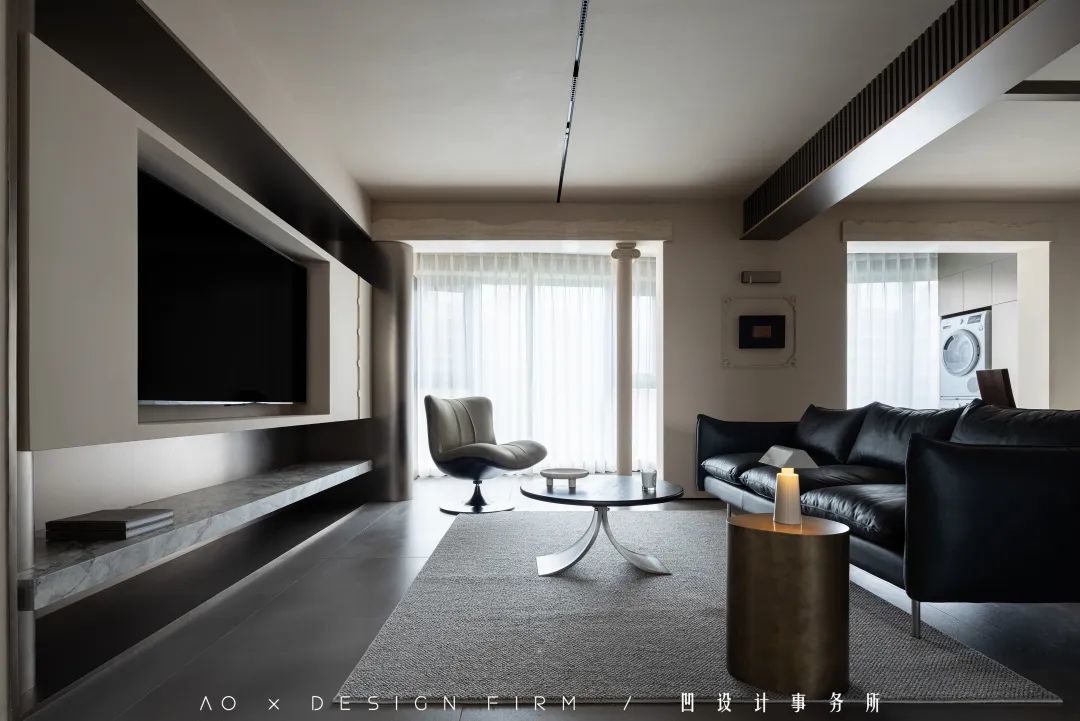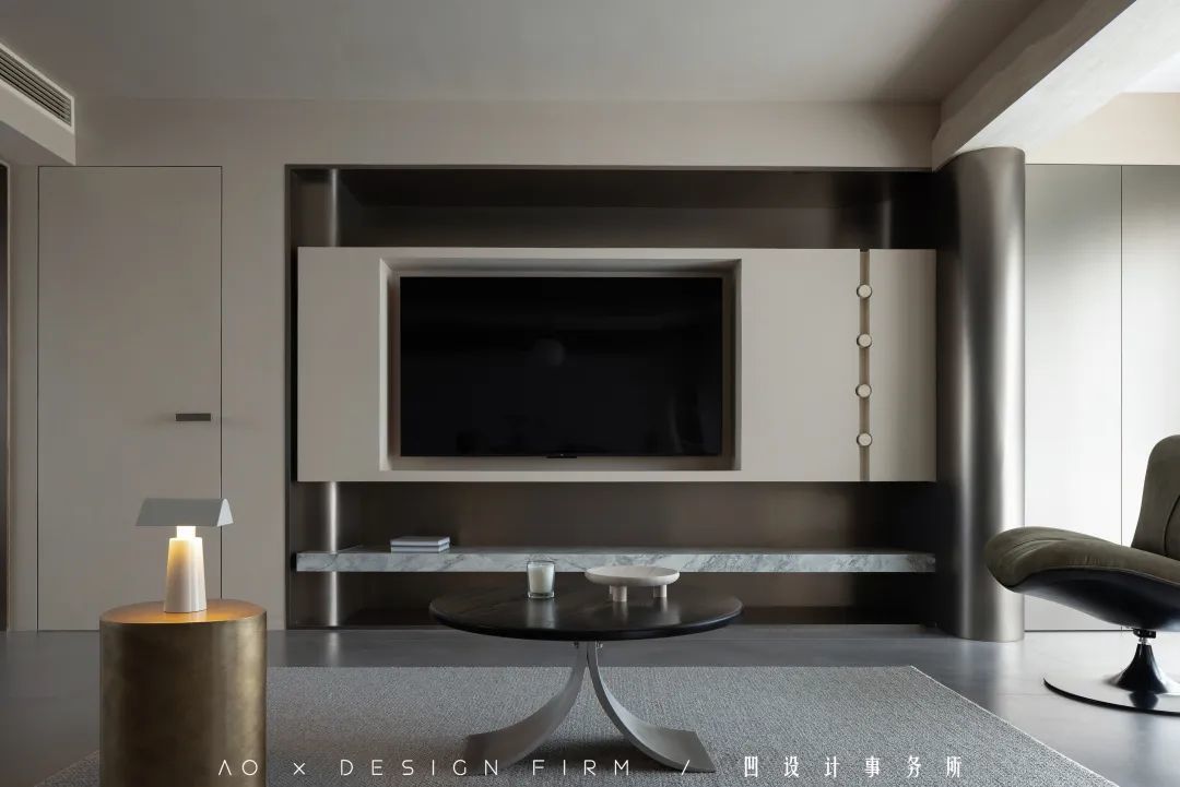 纳入客厅的阳台区域,圆弧形包裹的金属板,与岩板、天然洞石等材质,勾勒出难以复刻的美妙氛围。