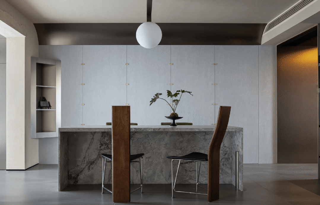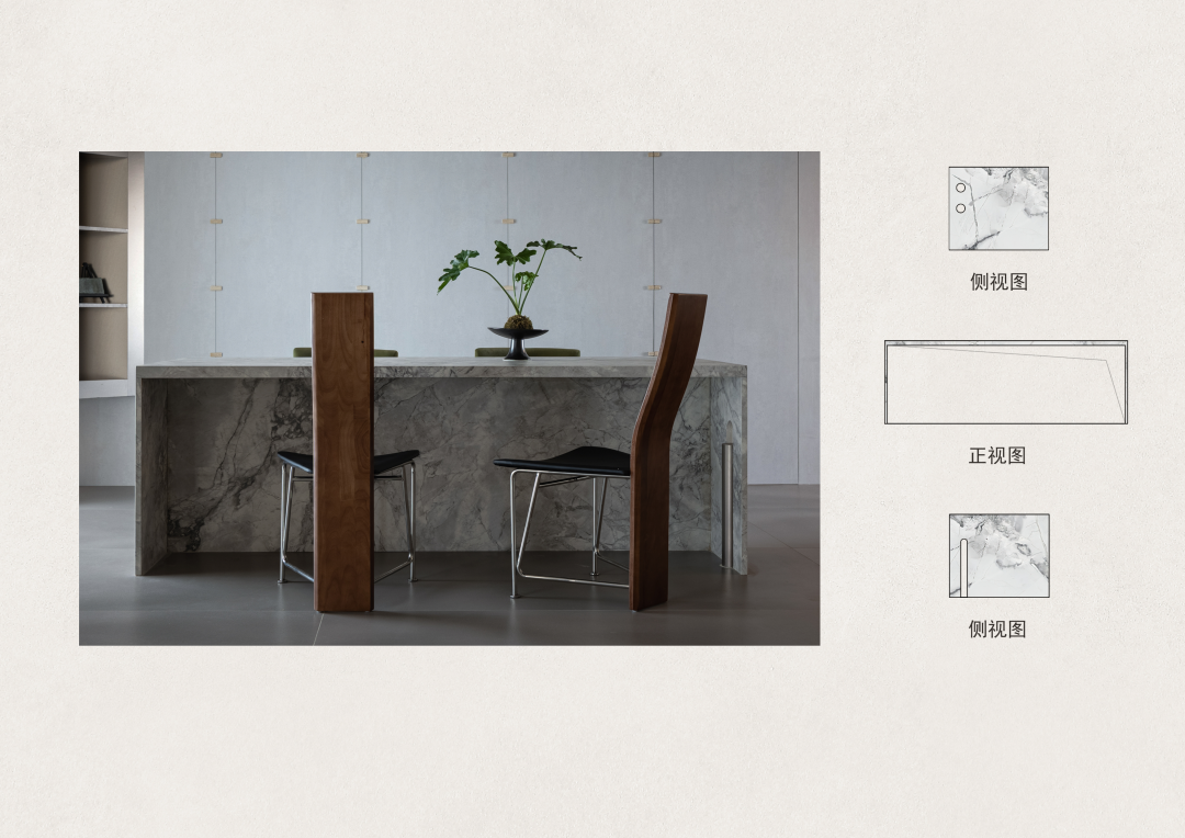 但整块的岩板材质,或多或少会让空间略显沉闷,所以在餐桌的两侧岩板进行了一些微处理。一侧的桌腿嵌入了金属板做的圆柱体,延续家里其它空间的金属元素。