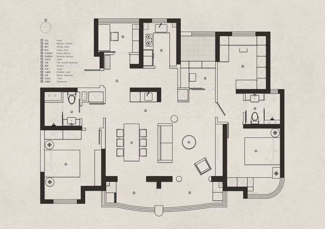 ○ 水吧、餐桌、沙发、阳台柱形成四条洄游动线,保持光线和视野的畅通