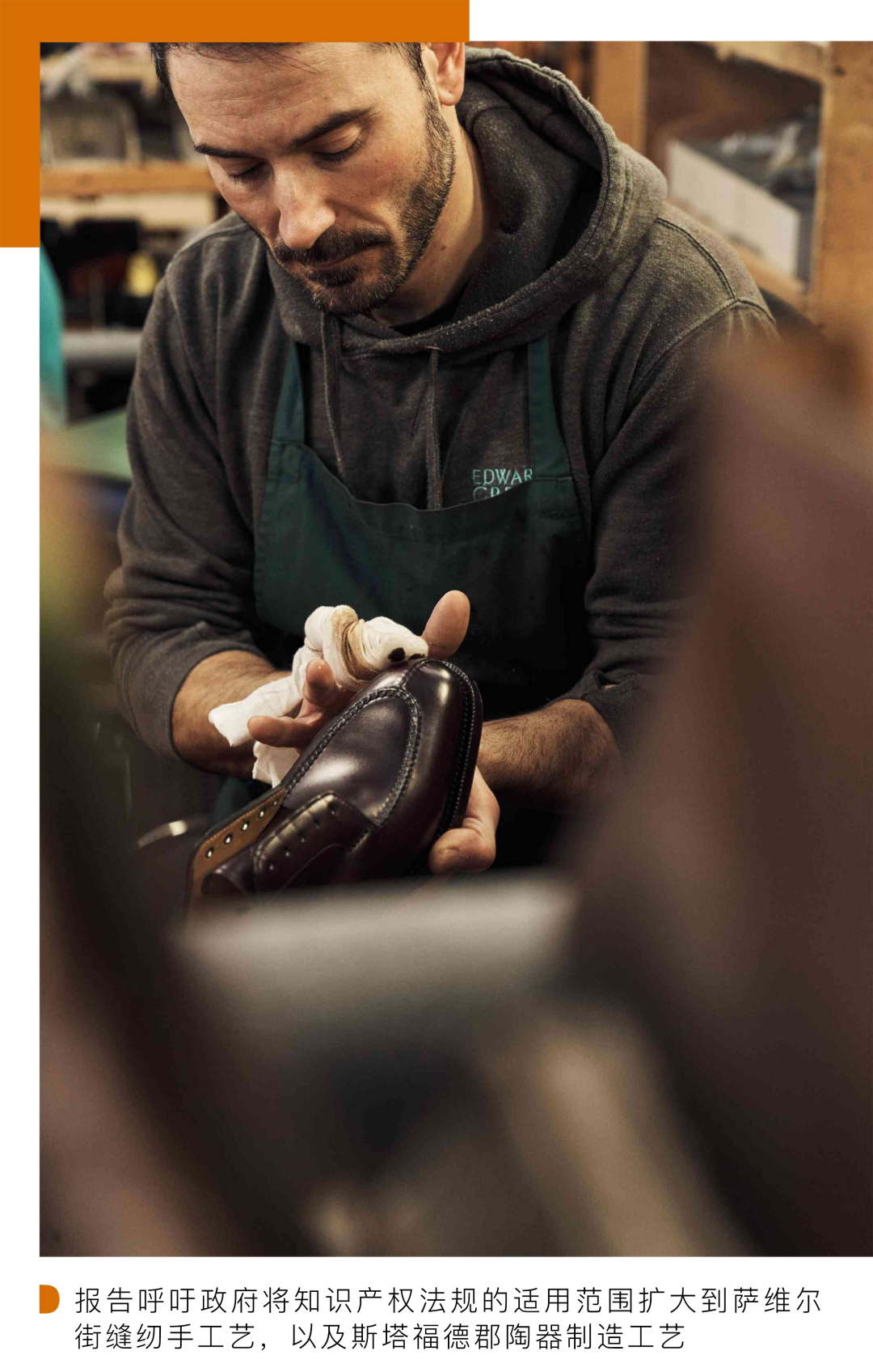 就知识产权法规的完善改进,报告呼吁政府将该法规适用范围扩大到萨维尔街缝纫手工艺,以及斯塔福德郡陶器制造工艺,并为此类传统技术提供与苏格兰威士忌类似的知识产权保护,尤其是在斯托克特伦特等地区,因为这些地区的制陶工艺正面临失传的风险。