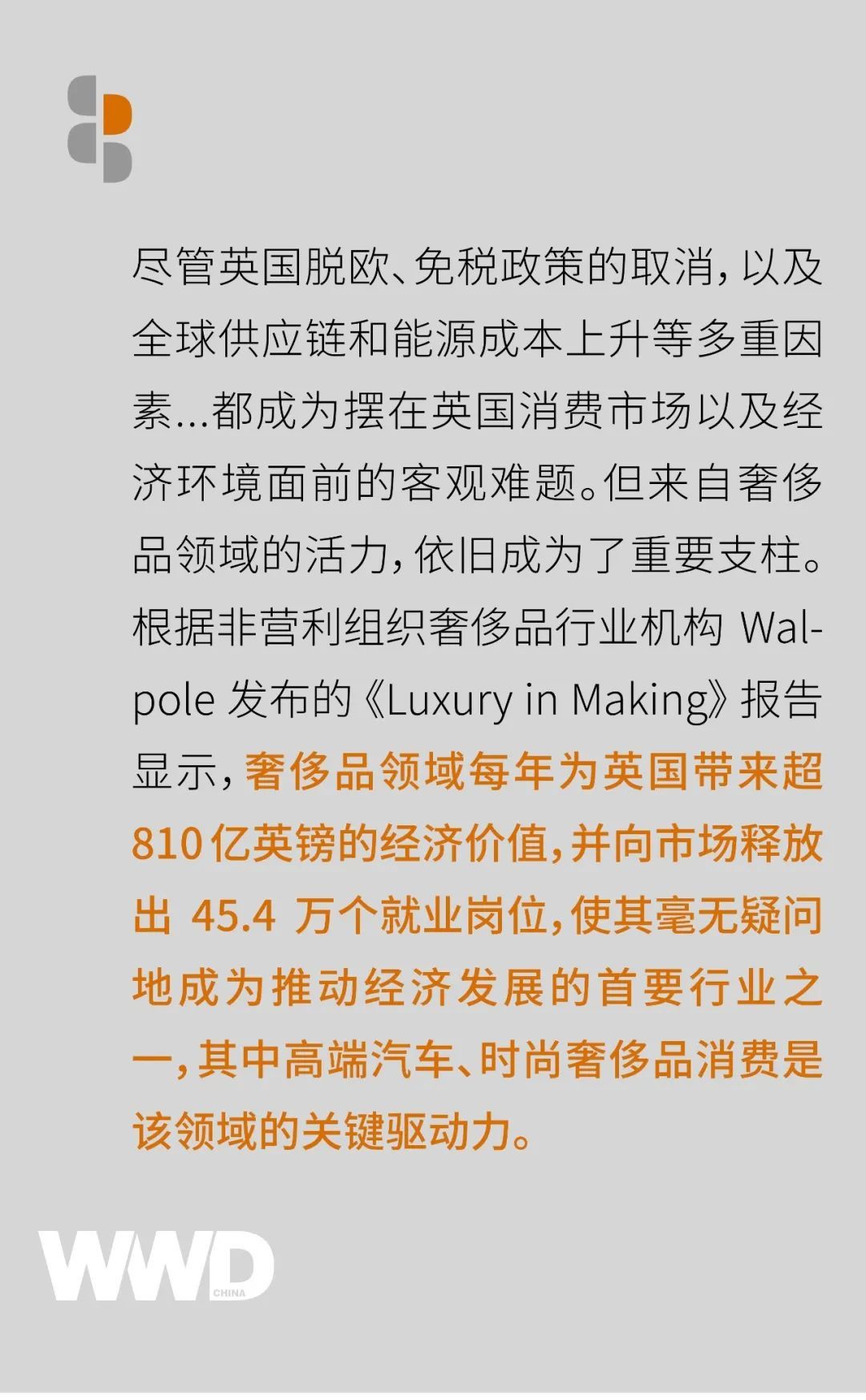 《Luxury in Making》是 Walpole 近五年以来的首份行业研究报告,与 Frontier Economics 合作发布。Walpole 是英国于 1992 年成立的一家非盈利机构,是英国奢侈品牌独家联盟,一直致力于推广、保护与发展英国奢侈品牌,并通过分享经验、资源为英国奢侈品企业提供服务。