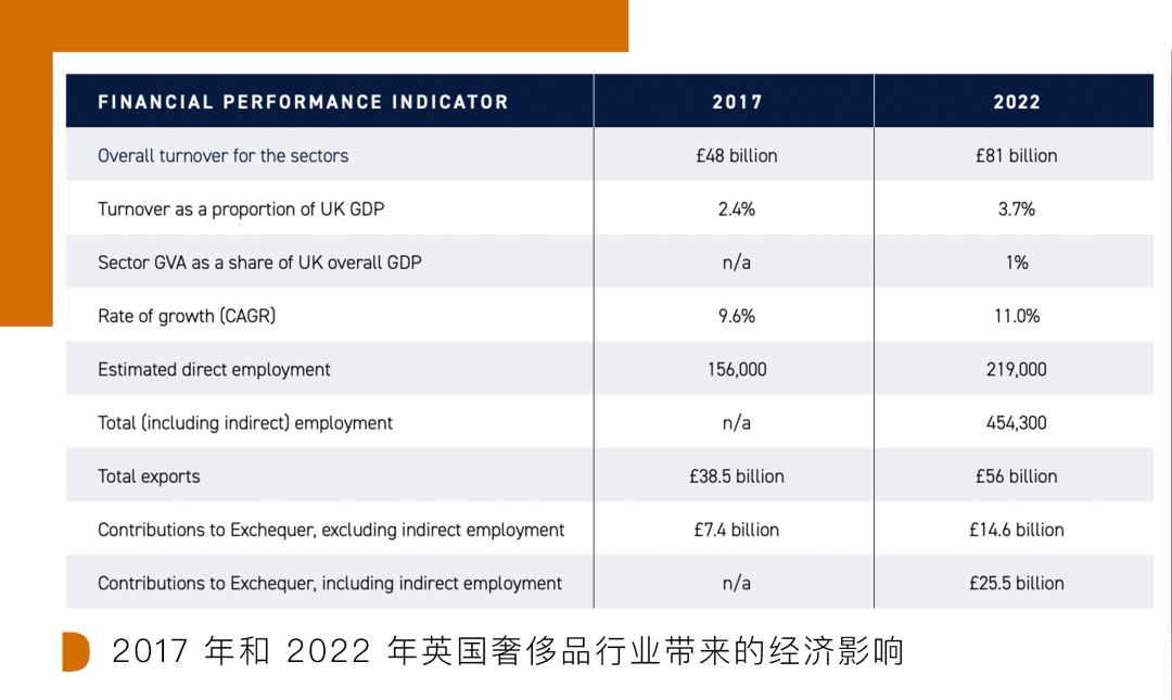 根据这份全新发布的《Luxury in Making》报告显示,在 2017 年至 2022 年五年时间内,英国奢侈品市场对当地经济贡献增长了 69%,相当于 GDP 的 3.7%;奢侈品行业的出口总额为 560 亿英镑,五年间增长了 45%。