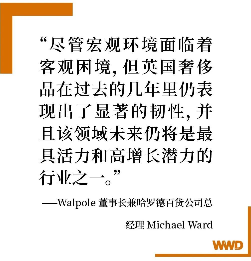 Walpole 董事长兼哈罗德百货公司总经理 Michael Ward 表示:“尽管宏观环境面临着客观困境,但英国奢侈品在过去的几年里仍表现出了显著的韧性,并且该领域未来仍将是最具活力和高增长潜力的行业之一。”他补充道,从这份报告可以看出,英国的奢侈品行业对于经济和文化生活是多么的重要。