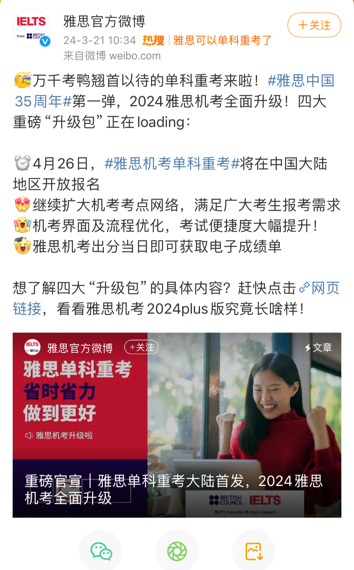 【#雅思可以单科重考了#,#雅思单科重考5月6日迎首考#】3月21日,@雅思官方微博 宣布:自2024年4月1日起,考生在中国内地参加过一次全科雅思机考并收到成绩单后,自考试日(即原成绩单上注明的考试日期)(羊城晚报)