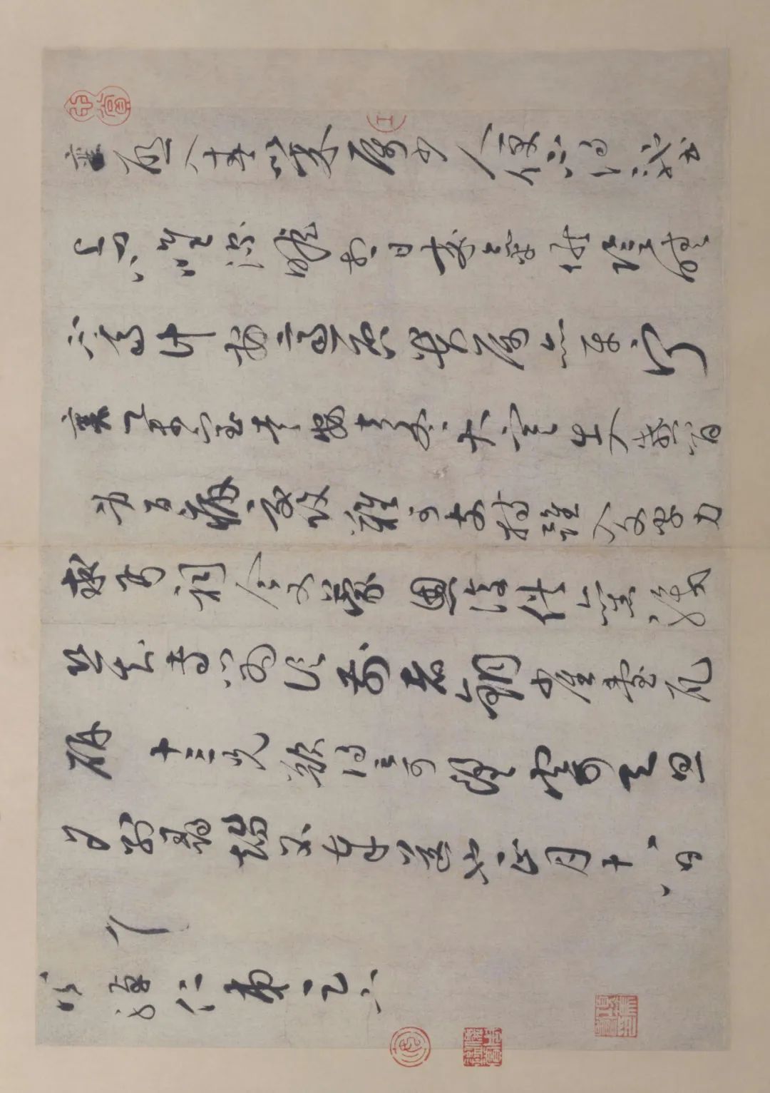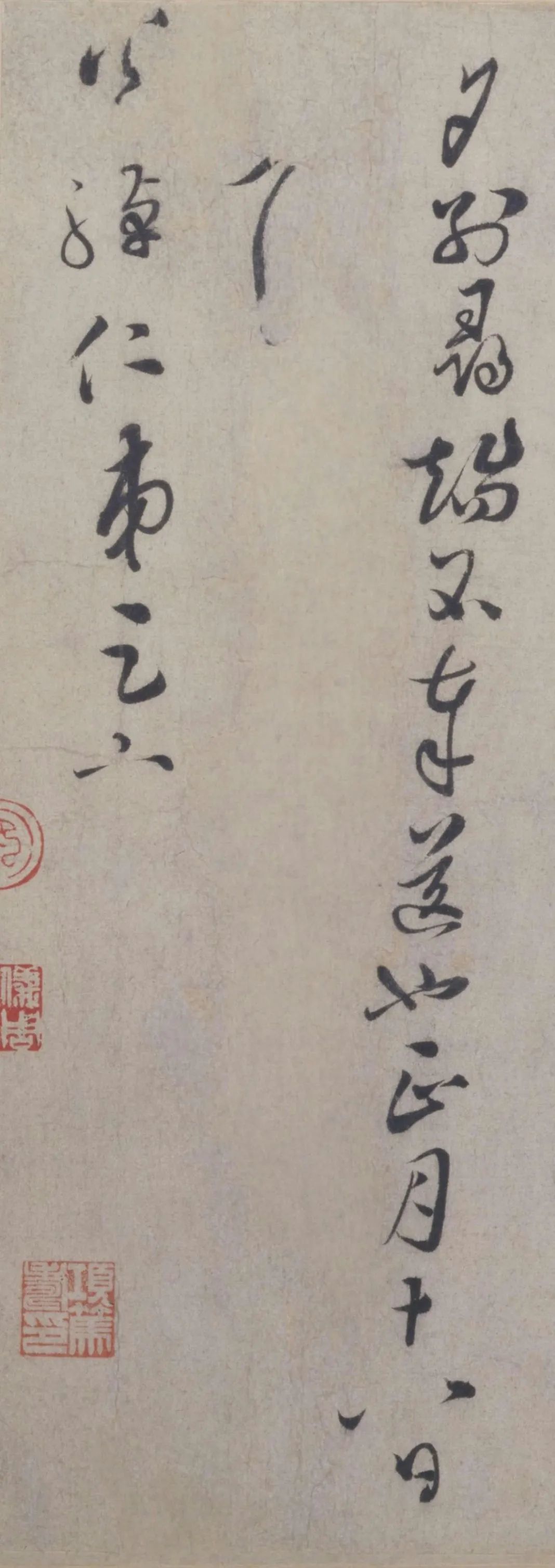草书十一行,书札。内容主要是告知对方自己“今又蒙恩,复供旧职”,并希望以端砚顶出前赠对方的铜雀台瓦砚,另赠“十三兄”。上款“公绰仁弟”,据考应当姓葛,是蔡襄妻族中的近亲。庆历三年,蔡襄“以秘书丞集贤校理知谏院兼修起居注”;皇祐三年,他罢福建路转运使任,赴京再官“修起居注”,即所谓“复供旧职”。这封书写于正月十八日,正在北上赴京途中,蔡襄时年四十岁。