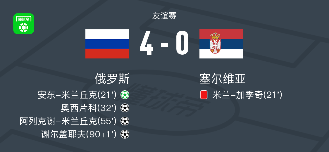 北京时间3月22日友谊赛,俄罗斯主场对阵塞尔维亚。上半场,米兰-加季奇拉人犯规染红,安东-米兰丘克点射破门,奥西片科低射建功。下半场,阿列克谢-米兰丘克扩大比分,谢尔盖耶夫铲射破门,最终,俄罗斯4-0塞尔维亚。