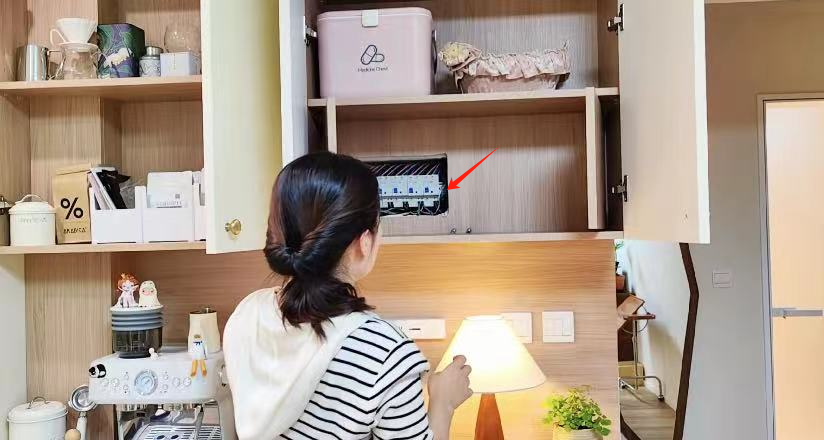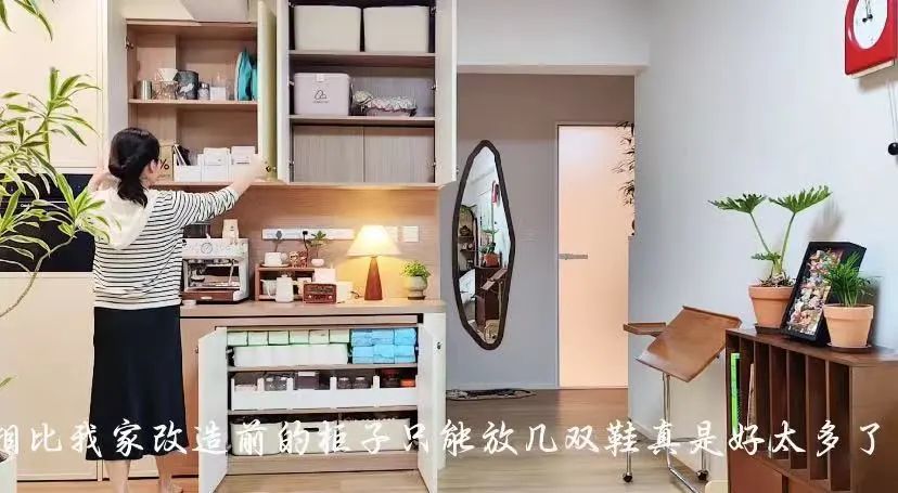 甚至柜门里的活动木板后还隐藏了电表箱,能装能遮丑,棒棒的~