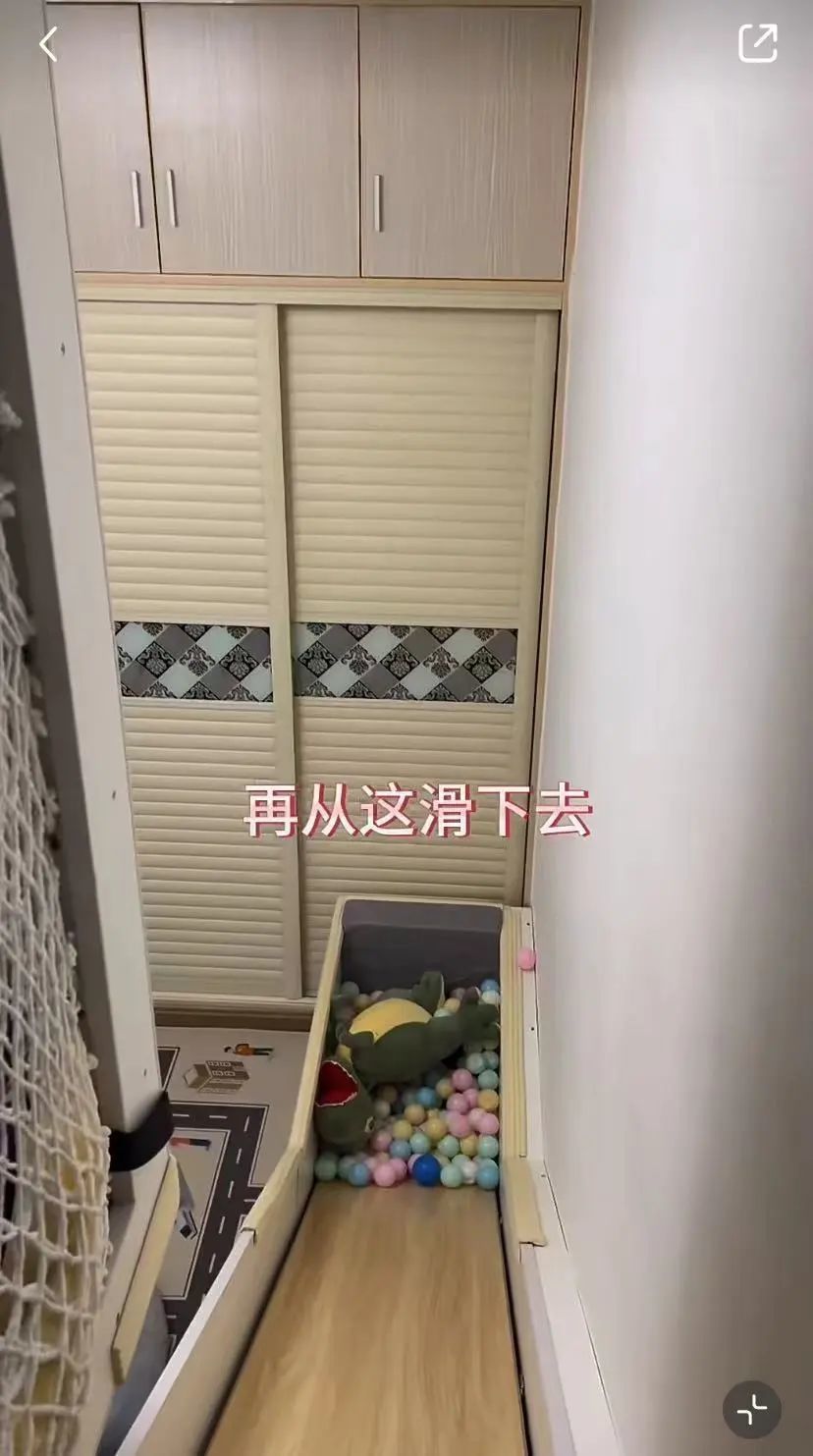 下床就是直接滑下来,滑到底部的海洋球坑里,坑内铺了软垫和大玩偶,不会磕碰受伤。