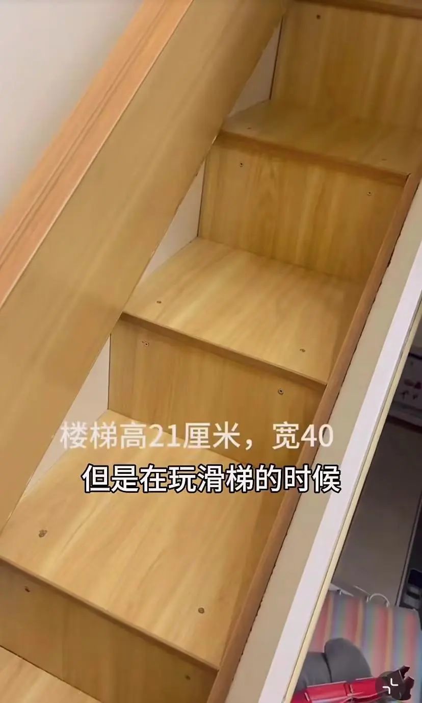 上床有台阶可以走,当把侧面的木板放下来,楼梯就变成了滑梯。