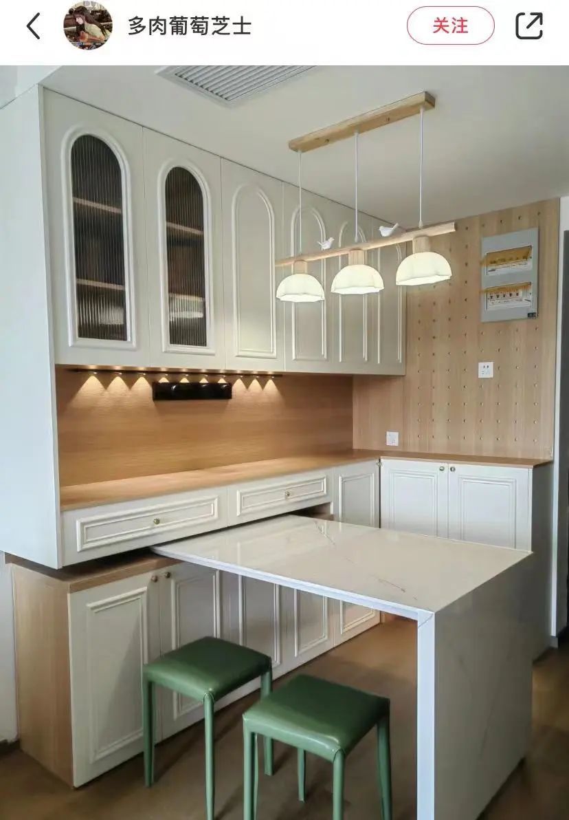 因此现在有些屋主选择了和餐桌一体的定制餐边柜,餐桌板隐藏在柜子台面的下方↓