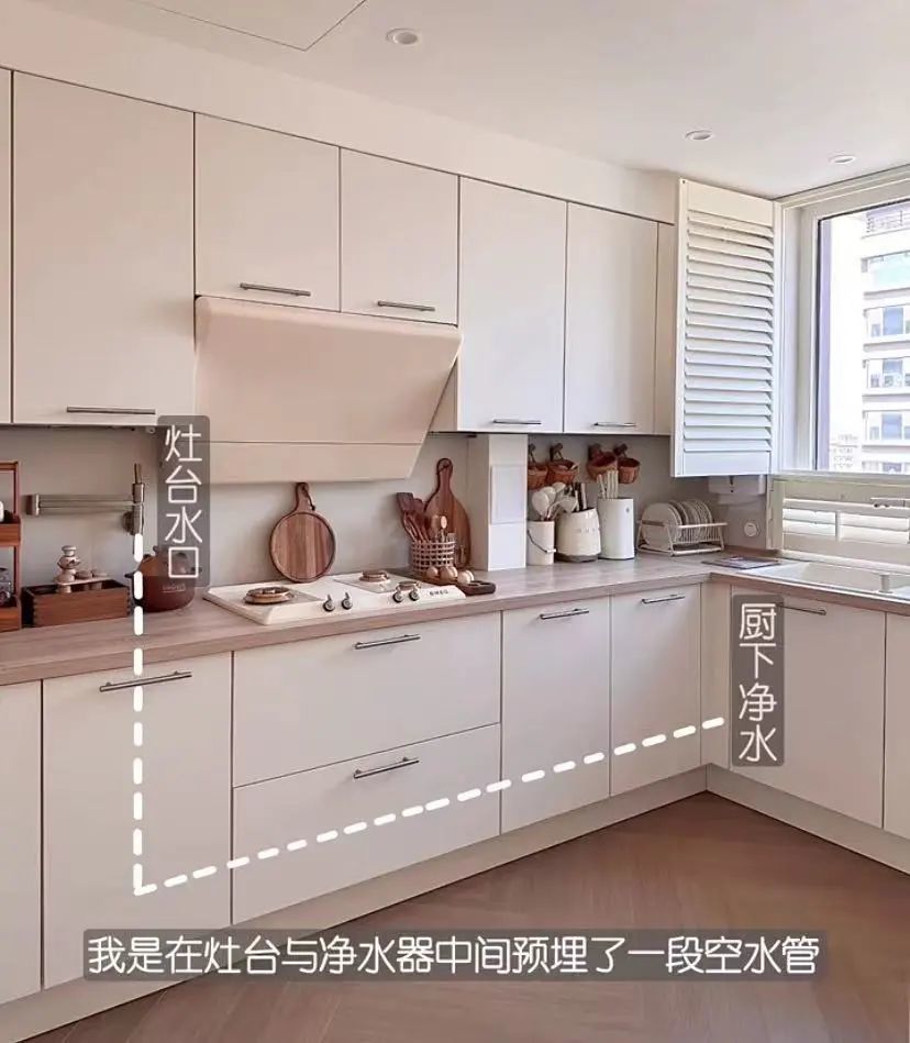 博主在自家净水器与灶台之间接了一段水管,在贴砖前预埋好,再在灶台处接一个水龙头就ok了。