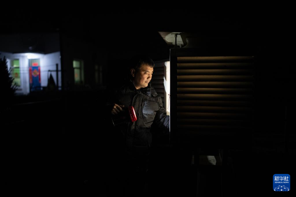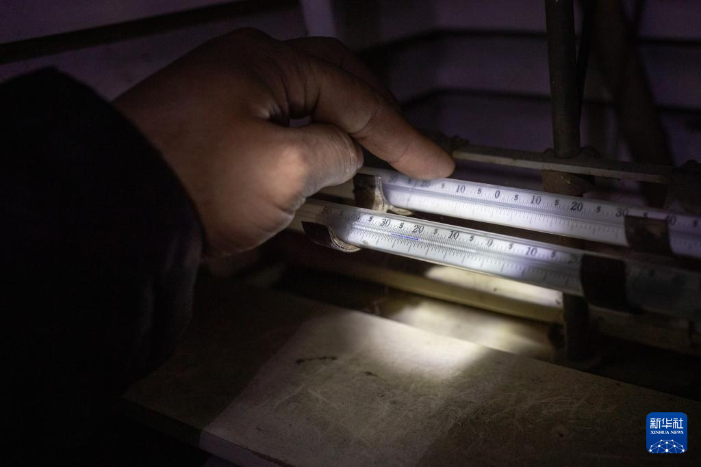 3月21日,在洛古河水文站内,马振国在观测气温数据。