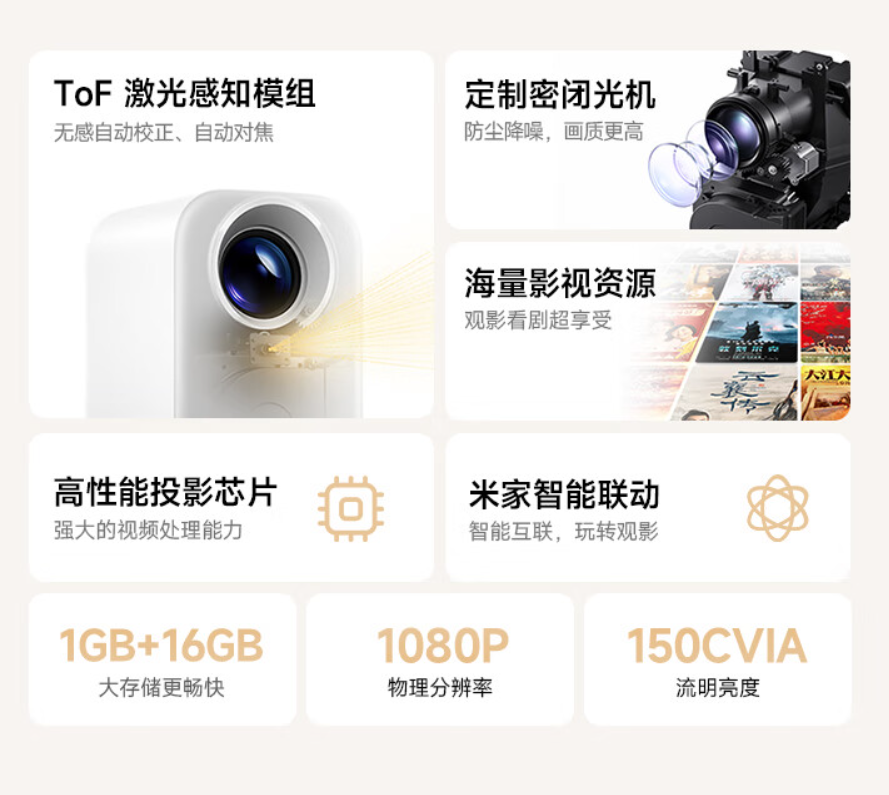 此外,Redmi 投影仪 Lite 版的物理分辨率来到了 1080P,并且支持 1.2:1 的透射比,可以实现 100 英寸的巨幕显示效果。同时,它配备了 ToF 激光感知模组,可以配合 AI 算法进行快速切准确地画面对焦与校正。
