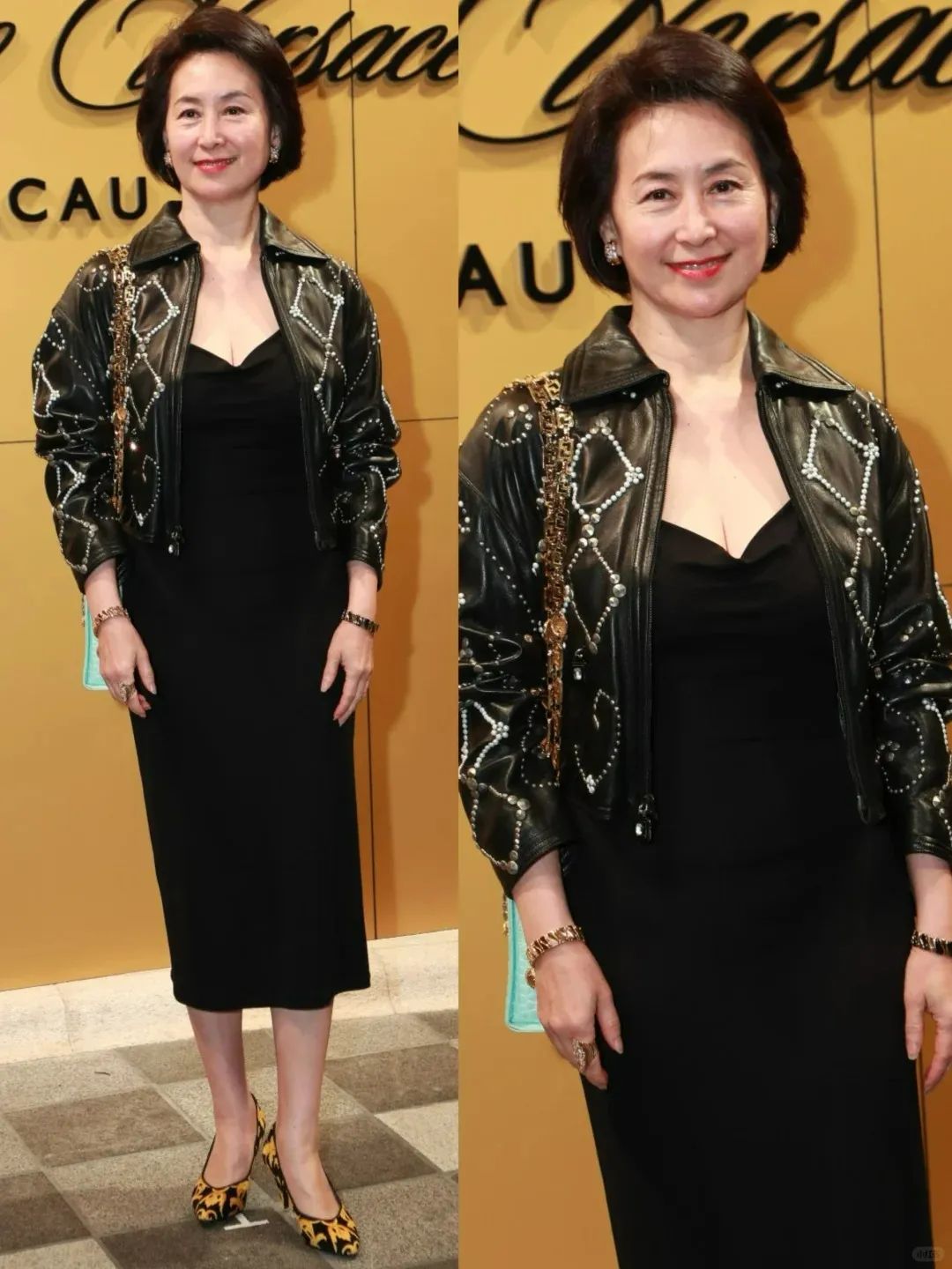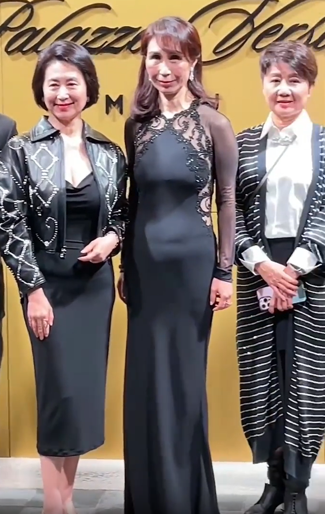 二房的女儿何超琼和何超凤,以及四房太太梁安琪在大合照里站在了C位区,分别出生于1962年、1964年和1960年的她们,虽然辈分不一样,但从年龄上来说算是同龄人。何超琼(左)用皮衣搭配晚礼服,高贵大方又不失休闲;何超凤(中)选了一条黑色晚礼服,比较适合她高挑的身形,但她的脸在镜头下显得有些奇怪;梁安琪穿得比较休闲,长款开衫搭配白衬衫和西装裙。
