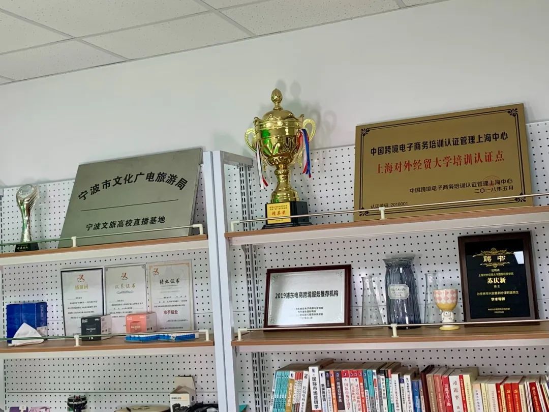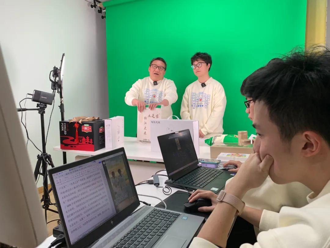 在这个不久前刚成立的“专属空间”里可以看到,产品货架、主播台位、背景幕布、直播大屏等一应俱全,并配备4K高清直播摄像机等全套直播设备。除了镜头前的主播,另外有两名学生正坐在一旁的工作台前,紧盯直播间画面和后台数据,承担场控角色。