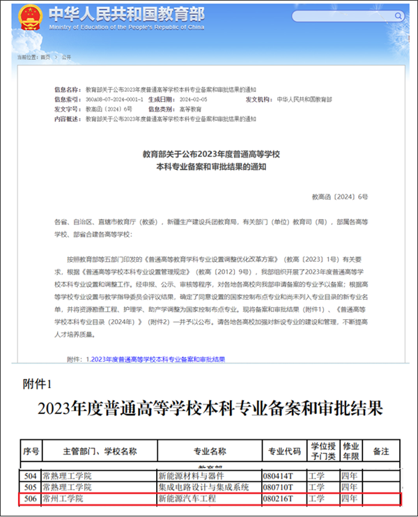 近日,教育部公布2023年度普通高等学校本科专业备案和审批结果,常州工学院申报的新能源汽车工程专业(专业代码080216T)成功获批。截至目前,常州工学院本科专业数达57个。